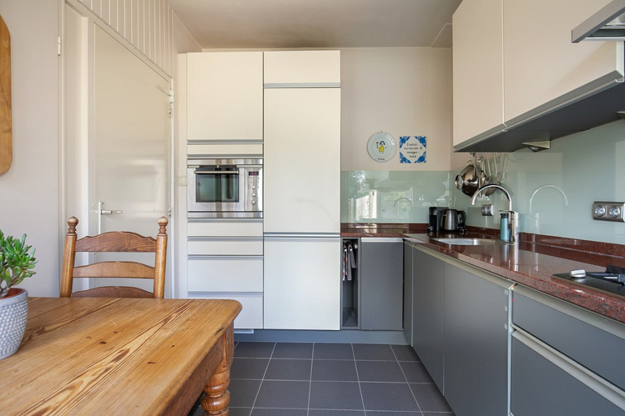 Vanuit de voortuin met oprit kom je binnen in de ruime vernieuwde hal. Hier bevindt zich de garderobe, trapopgang, meterkast en toegang naar het moderne toilet met fontein. De hal en toiletruimte zijn voorzien van een mooie plavuizen vloer met vloerverwarming. De inpandige berging is via de hal te bereiken en heeft tevens een loopdeur naar de achtertuin. De Z-vormige woonkamer is voorzien van een mooie massief Inlandseiken houten vloer en heeft door de vele raampartijen prachtig lichtinval. Ook is er een praktische trapkast aanwezig. De dichte eigentijdse keuken is in 2004 vernieuwd en voorzien van een 4-pits gasfornuis, afzuigkap, combi-oven en vaatwasser. Vanuit de keuken is er een loopdeur naar de achtertuin.