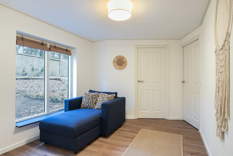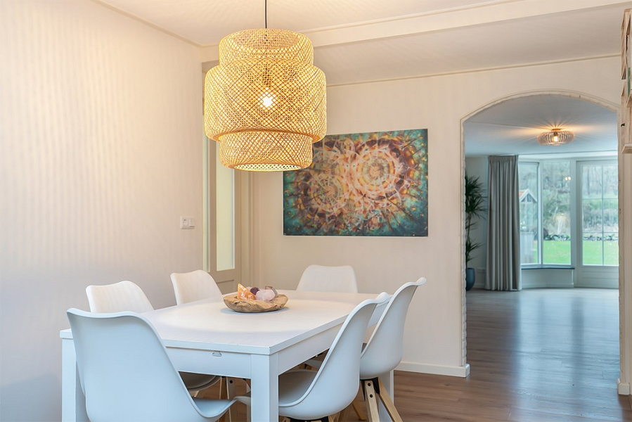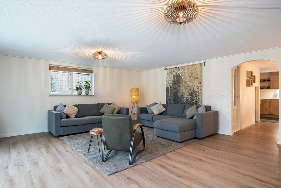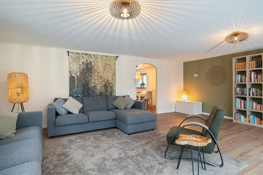 In deze hal is ook een leeshoek gecreëerd met prachtig uitzicht op de tuin, zodat je je heerlijk onder het genot van een kopje thee terug kunt trekken.