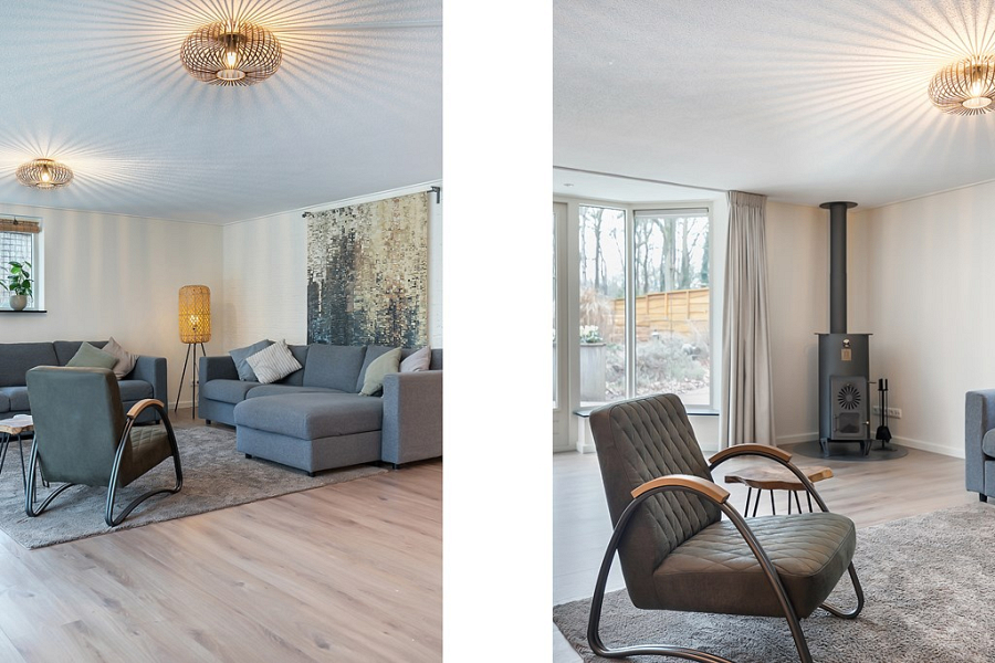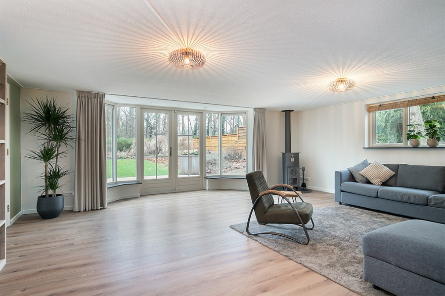 Vanuit het bospad loop je de poorten van nummer 5 door, via de fraai aangelegde oprit kom je uit bij de entree van de woning. In deze entree is de meterkast, een garderobe en een inbouwkast gesitueerd. Via de entree kom je in de ruime woonkamer, welke voorzien is van een erker met openslaande tuindeuren naar het terras en met een prachtig uitzicht op de tuin en het omringende bos. Tijdens de koude dagen kun je hier ook genieten van de behaaglijke warmte van de nieuwe Rocket Stove houtkachel.