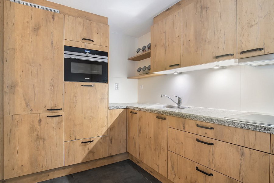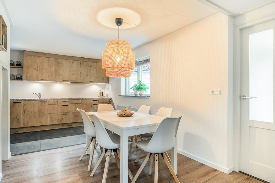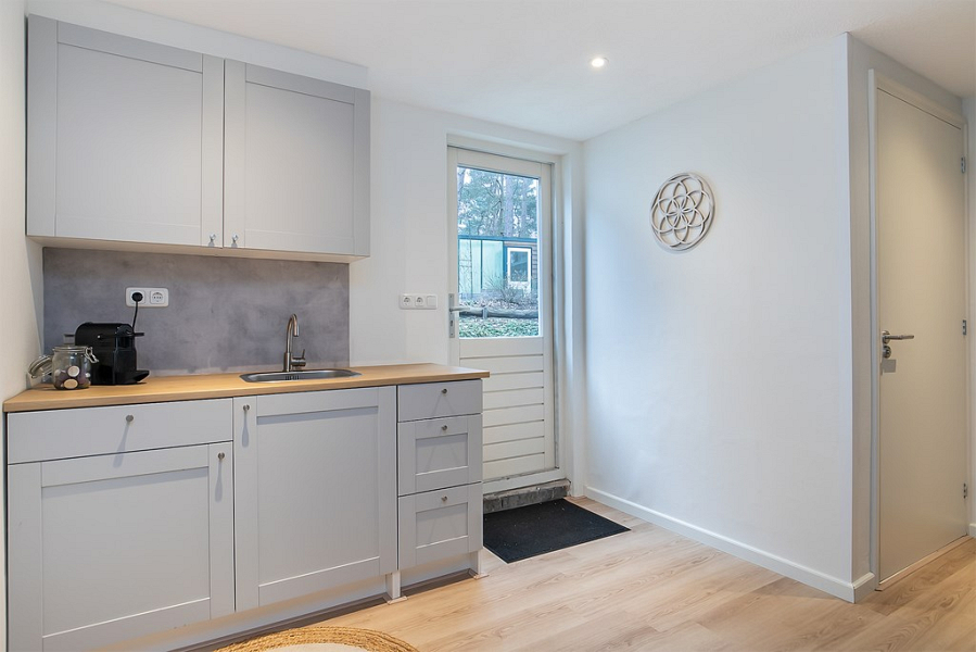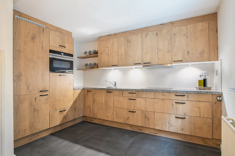 De halfopen woonkeuken is gelegen aan achterzijde van de woning en van alle gemakken voorzien zoals een inductie kookplaat, afzuigkap, koelkast, vaatwasser, oven en veel werk- en kastruimte.