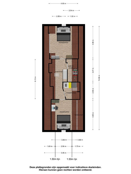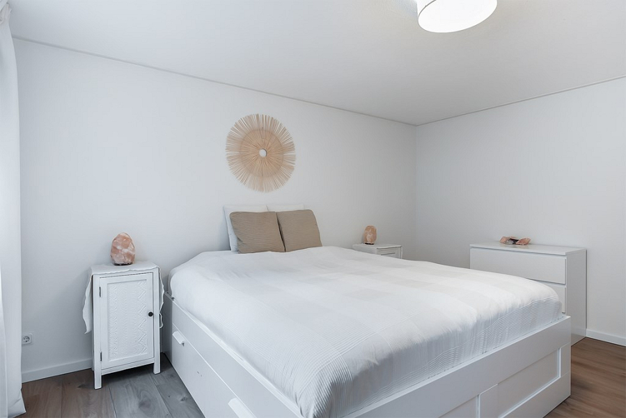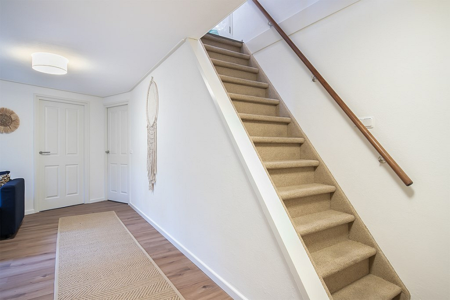 Aan de linkerzijde van de keuken is een ruime hal aanwezig die toegang biedt tot het gastentoilet, de provisiekast, de trapopgang naar de eerste verdieping en 2 slaapkamers waaronder de masterbedroom.