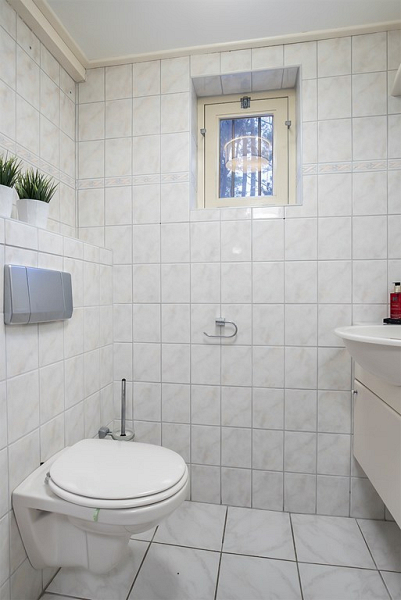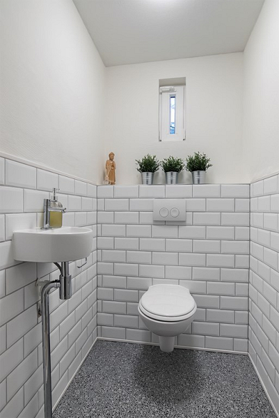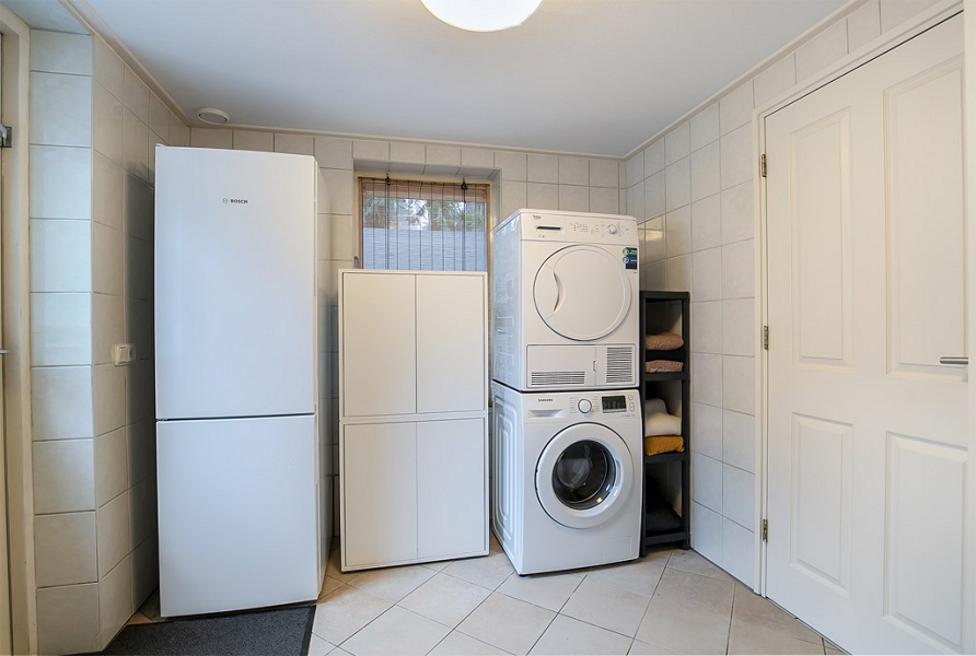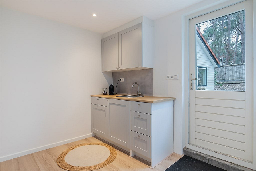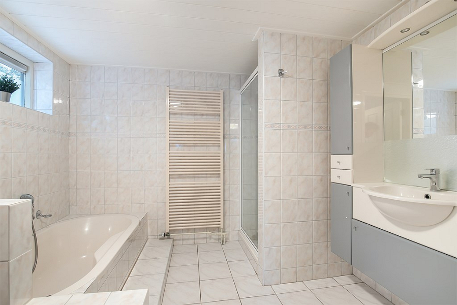 Aan de rechterzijde van de keuken is de praktische bijkeuken gesitueerd, met de witgoedopstelling, de CV-ruimte en een deur naar de tuin. Via de bijkeuken is ook de ruime badkamer te bereiken met douchehoek, ligbad, toilet en wastafelmeubel.