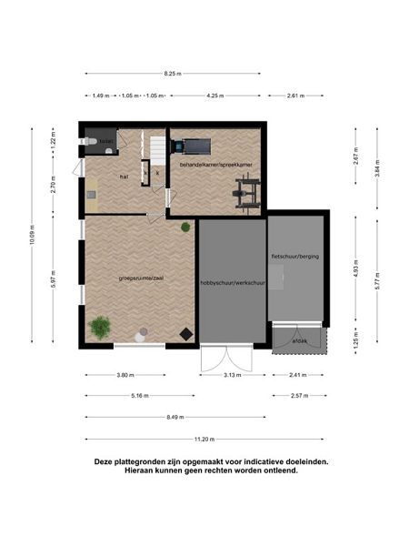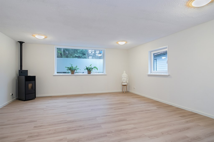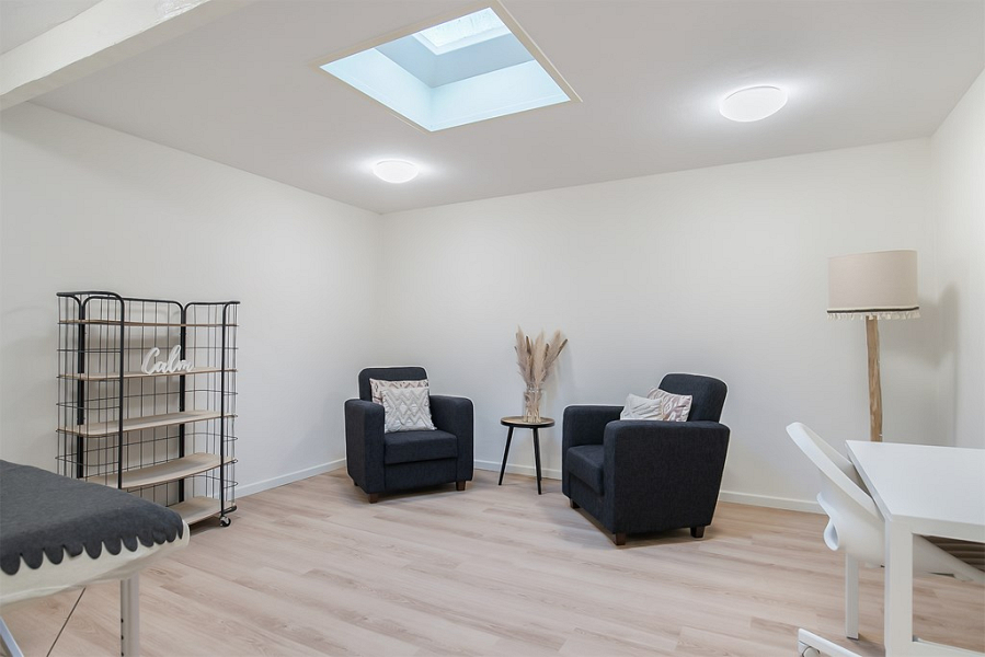 De in het centrale bijgebouw gerealiseerde praktijkruimte (2021) heeft een vloeroppervlakte van 67m2. De praktijkruimte is volledig (vloer, wanden, plafond) geïsoleerd, heeft kunststof kozijnen met HR++ beglazing en wordt verwarmd door een houtpelletkachel (2021).