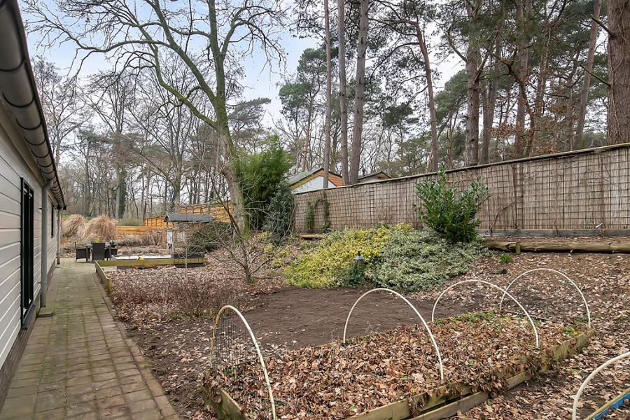 Op het zuiden tegen de schutting groeien diverse soorten vruchtgewassen (braam, framboos, kruisbes, zwarte bes, druif) en verder telt de tuin 2 appelbomen, 4 perenbomen, 1 pruimenboom, 1 walnotenboom en een grote blauwe bessenstruik. De moestuin met aardappelveldje, kruidentuin en aardbeienplantjes is klaar voor het nieuwe teeltseizoen. Ook is er een grote compostbak aanwezig om het tuinafval te recyclen en daarmee de bodemwaarde natuurlijk op peil te houden.