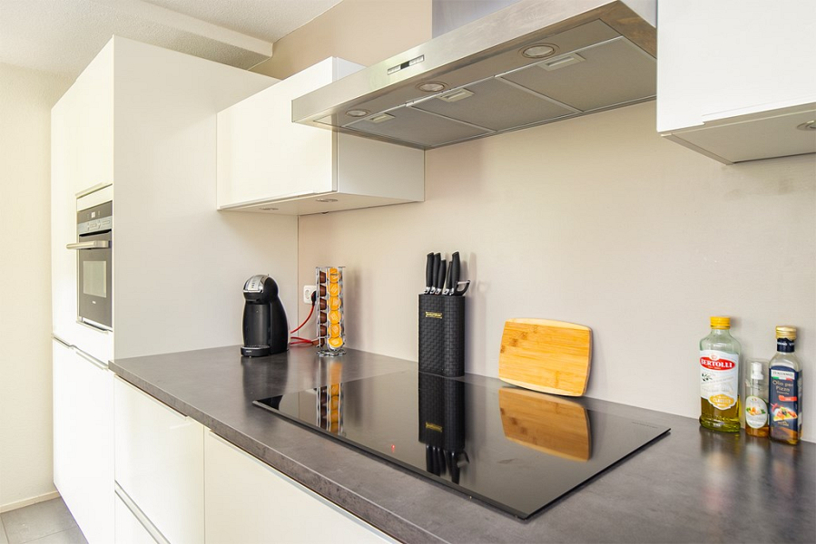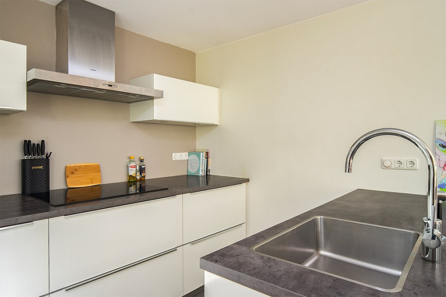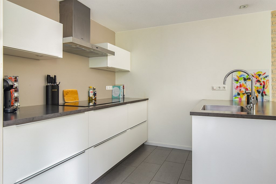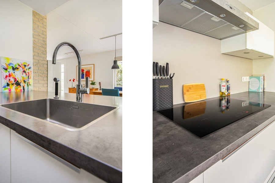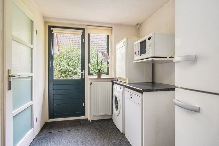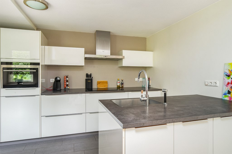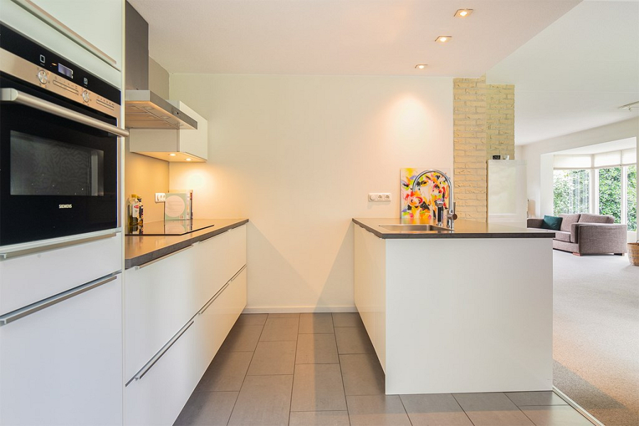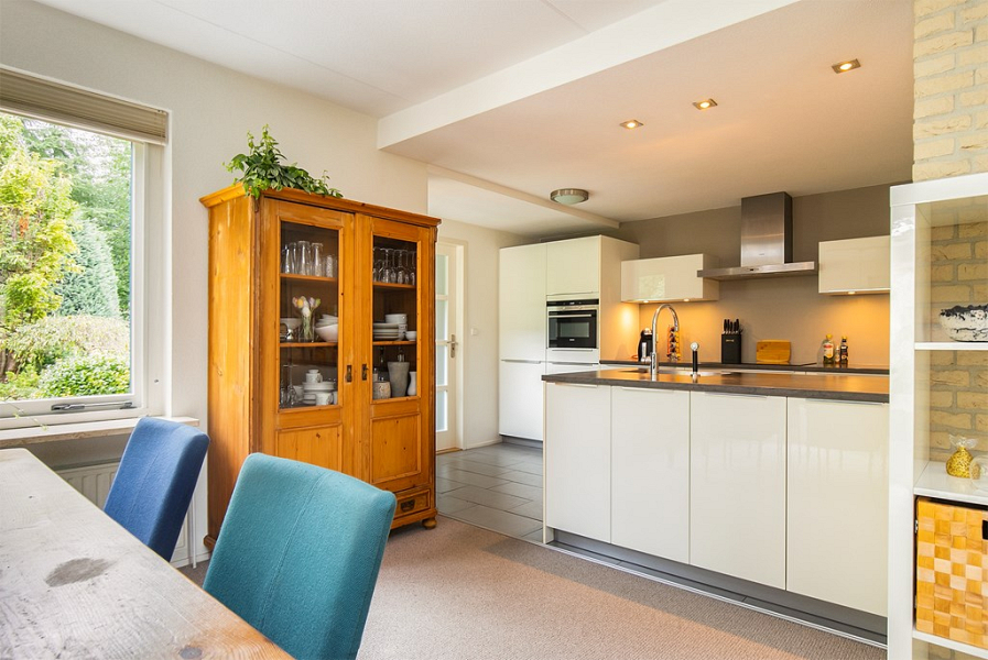 De moderne keuken met schiereiland is van alle gemakken voorzien, zoals een inductiekookplaat, afzuigkap, koelkast en combi-oven. In de aangrenzende praktische bijkeuken bevindt zich de vaatwasser, de huidige bewoners hebben bewust voor meer kastruimte in de keuken gekozen. Dit kan uiteraard naar wens aangepast worden. Tevens zijn ook de witgoedaansluitingen aanwezig in deze ruimte. De deur in de bijkeuken brengt je in de garage. Deze kan voor diverse doelen gebruikt worden.