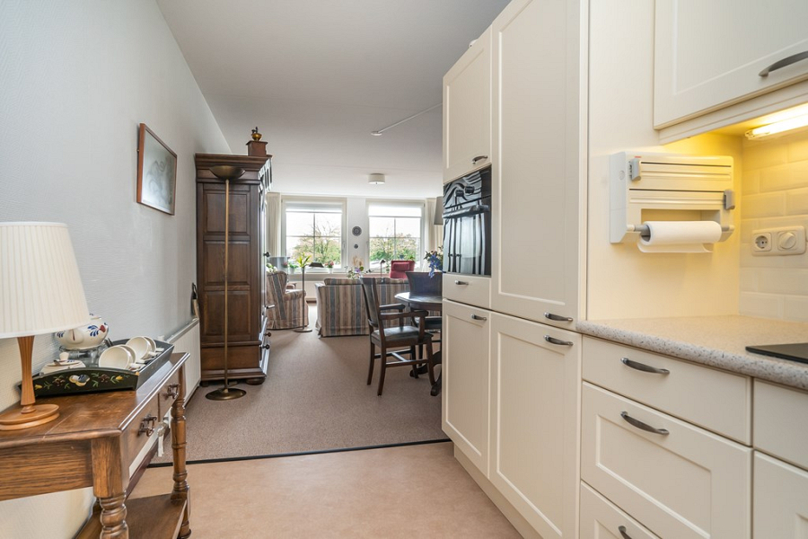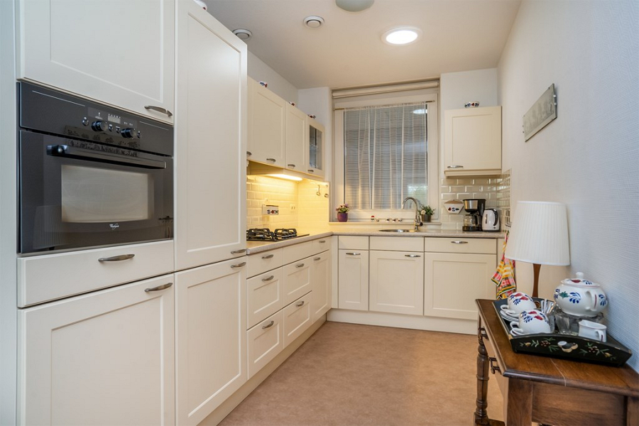 Aan de voorzijde van het appartement is de keuken gesitueerd, uitgevoerd in een lichte, neutrale kleurstelling voorzien van inbouwapparatuur, te weten een vaatwasser, koel-/vriescombinatie, combi-oven/magnetron, afzuigkap en 4-pits gaskookplaat. Tevens is in de keuken een Solatube aanwezig voor meer daglicht toetreding.