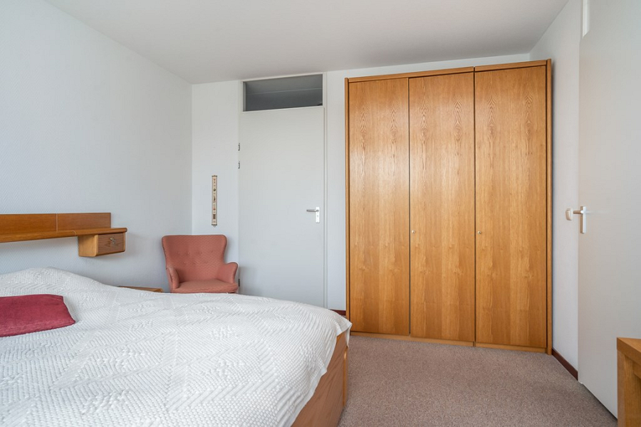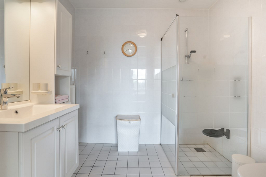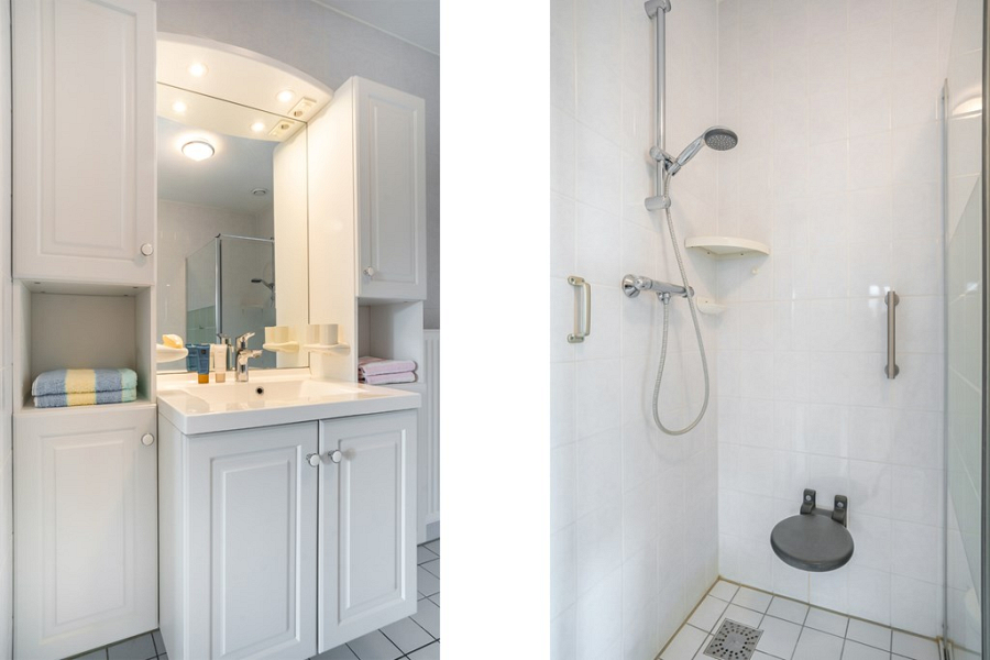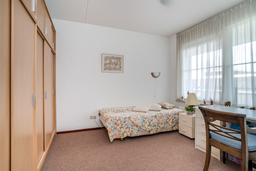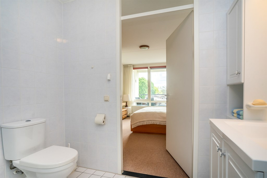 Vanuit de woonkamer bereik je de 2e royale slaapkamer met aangrenzende badkamer. De badkamer is voorzien van een douchehoek, vaste wastafel met meubel en 2e toilet.