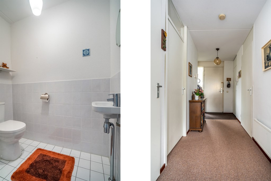 De hal geeft toegang aan de meterkast, een praktische berg-/was-/stookruimte, toiletruimte en de eerste royale slaapkamer.