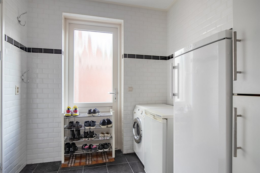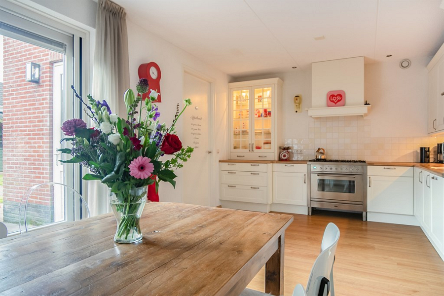 In de aangrenzende praktische bijkeuken bevinden zich de witgoedaansluitingen. Via de bijkeuken kom je vervolgens in de garage. Deze ruime garage kan voor diverse doelen gebruikt worden, heeft een deur naar de achtertuin en openslaande deuren naar de oprit.
