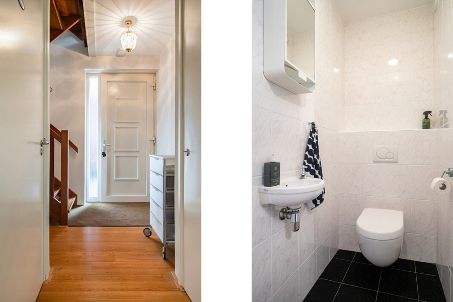 Vanaf de oprit met carport, kom je binnen in de hal met garderobe, trapopgang, meterkast en toiletruimte. Vanuit de hal bereik je de woonkamer, welke door de grote raampartijen zeer licht te noemen is. De erker en de en-suite deuren maken de woonkamer compleet. Het gevoel van een jaren '30 woning, maar dan in een nieuw en modern jasje! De riante woonkeuken is tuingericht en voorzien van openslaande deuren. Hier is plek genoeg voor een enorme eettafel, waar je met vrienden en/of familie avonden heerlijk kunt tafelen. De Bruynzeel keukenopstelling is ook van alle gemakken voorzien zoals een prachtige Boretti 6-pits gasfornuis met oven, een combi magnetron, een vaatwasser, afzuigkap en koelkast. Iedere thuiskok wordt hier toch blij van?