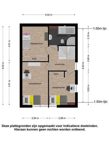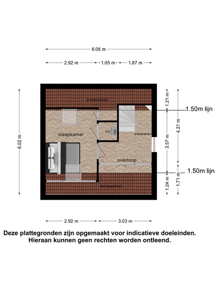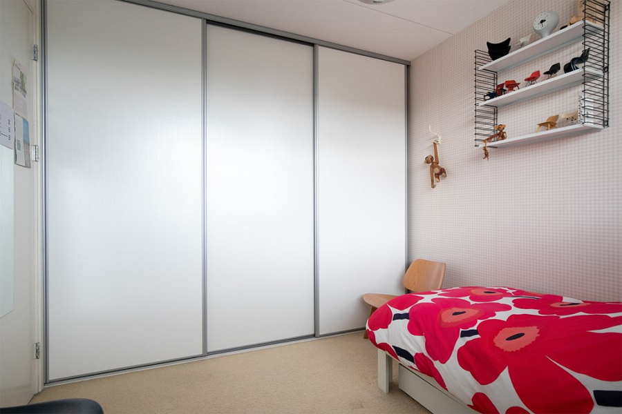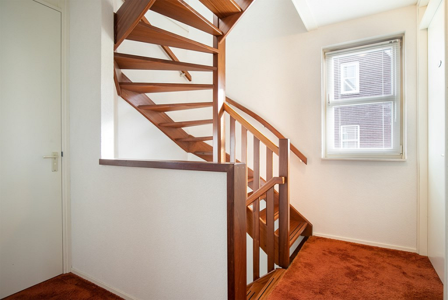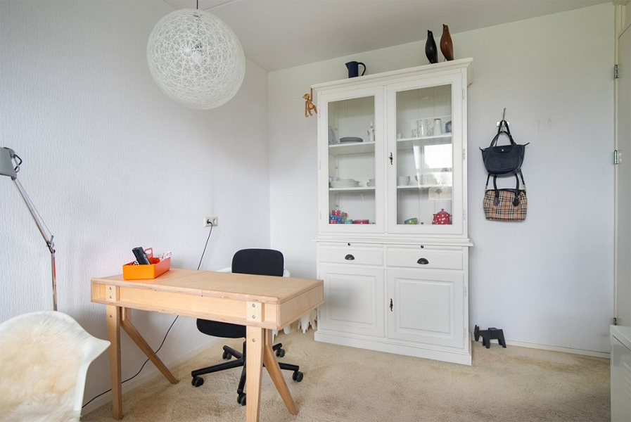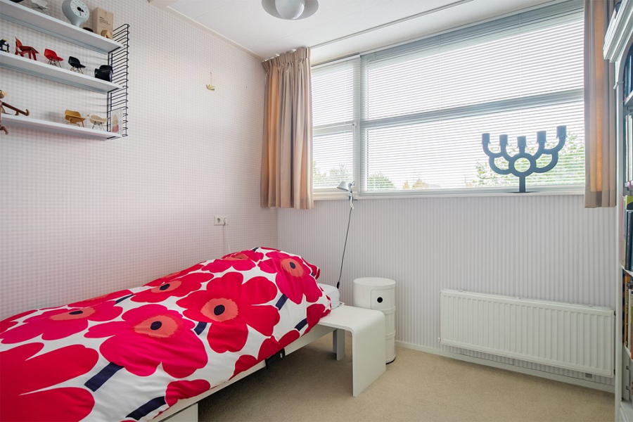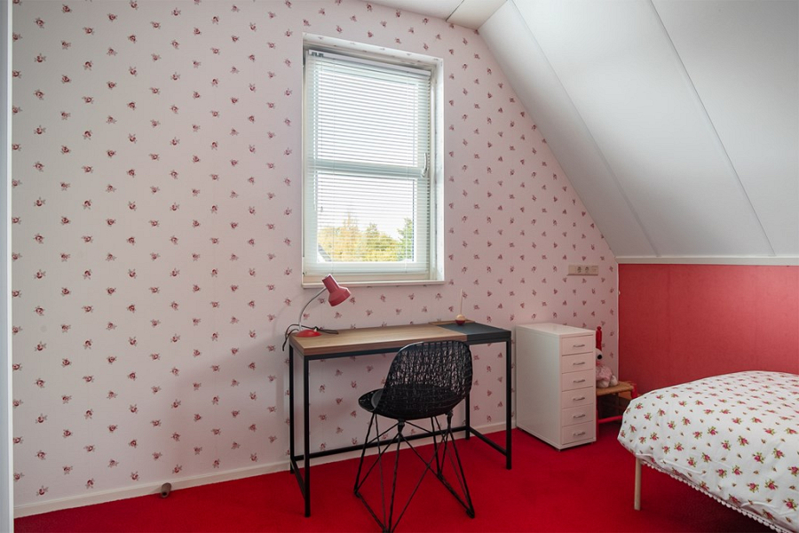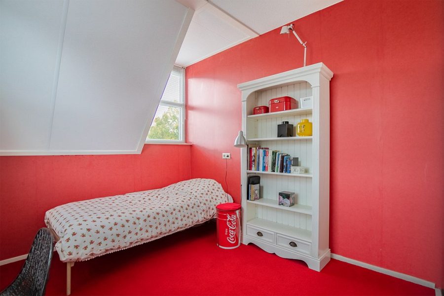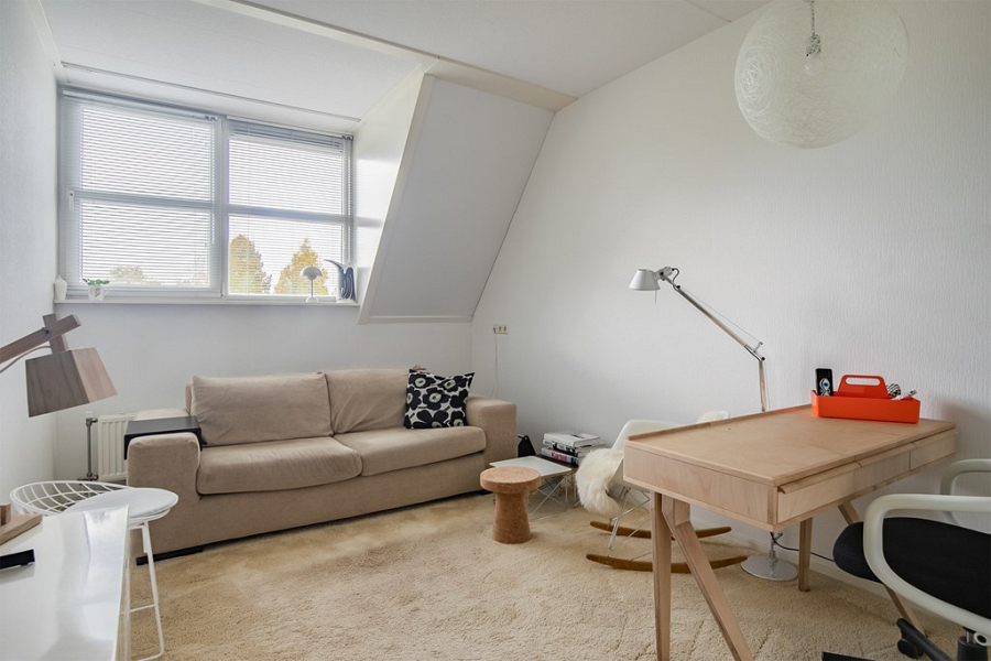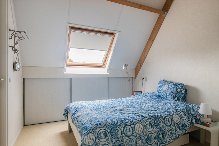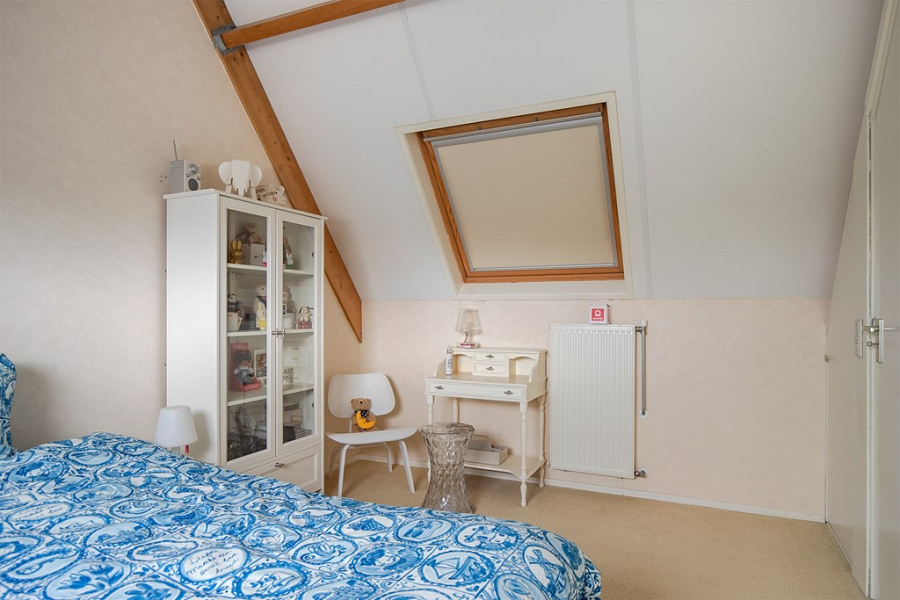 Als wij nog een verdieping omhoog gaan komen wij uit op de overloop van de 2e verdieping. Hier bevindt zich een zeer ruime vaste kast voor het opbergen van spullen. Als wij de hoek omlopen komen wij in de 4e slaapkamer met dubbele dakramen.