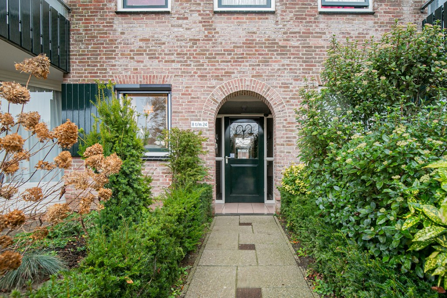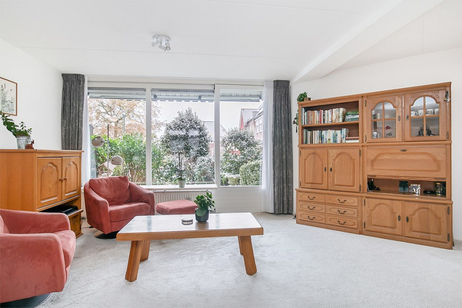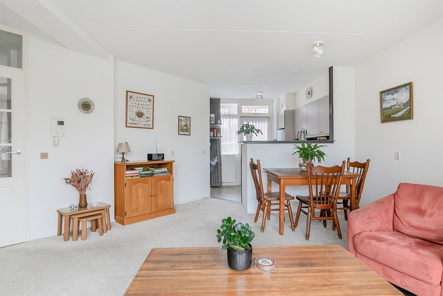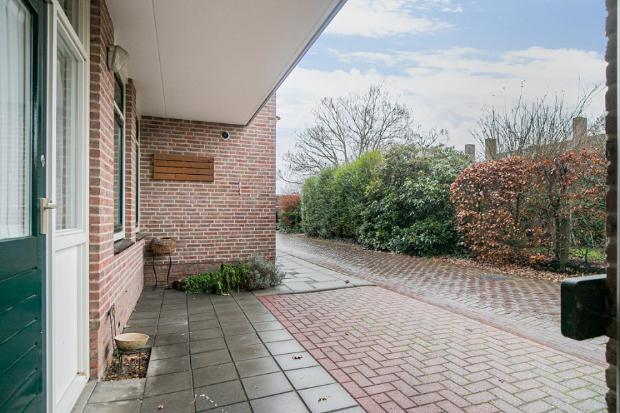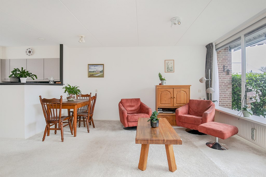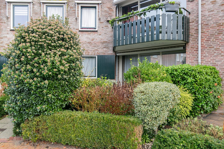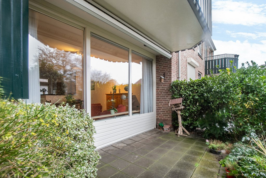 Door de grote raampartijen is de woonkamer zeer licht te noemen. Ook is er vanuit de woonkamer, d.m.v. een schuifdeur, toegang naar de eigen voortuin. Deze is gelegen op het westen en voorzien van een gezellig terras met mooie beplanting. Daarbij is er ook vrij uitzicht over het hofje met openbaar groen en een speeltoestel voor de (klein)kinderen.