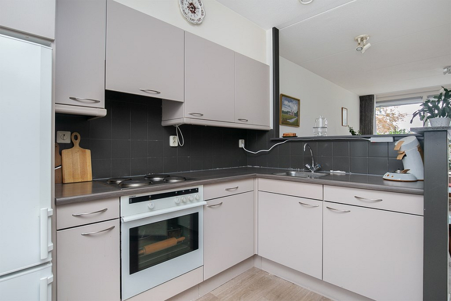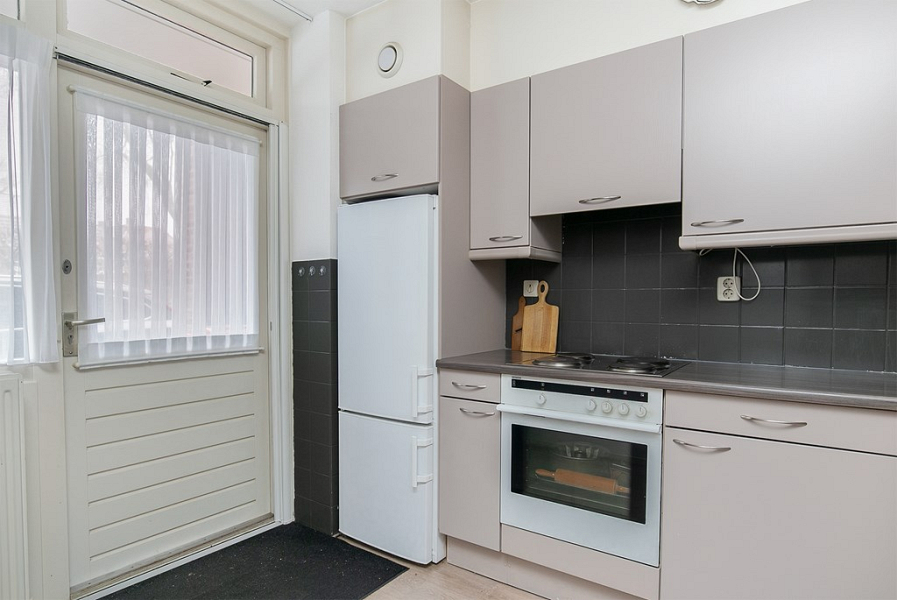 De eenvoudige keuken is gelegen aan de achterzijde en voorzien van een elektrische kookplaat, oven en afzuigkap.
