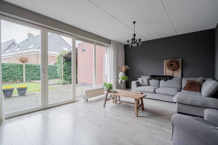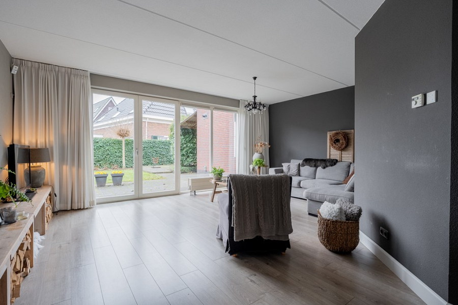 De woonkamer is aan de achterzijde van de woning gelegen met zicht op de tuin, welke middels openslaande deuren te bereiken is. Een ideale plek om tot rust te komen, met vrienden te borrelen of een goede film te kijken.