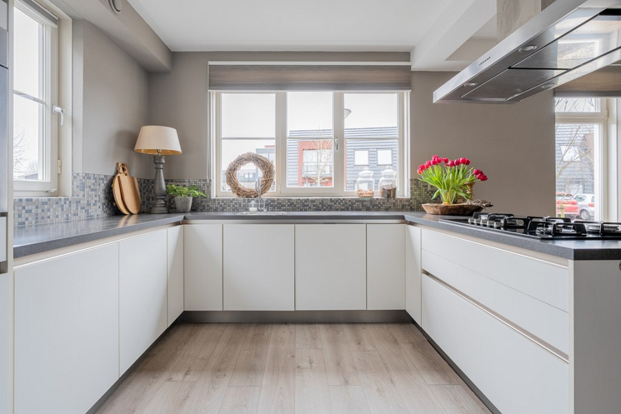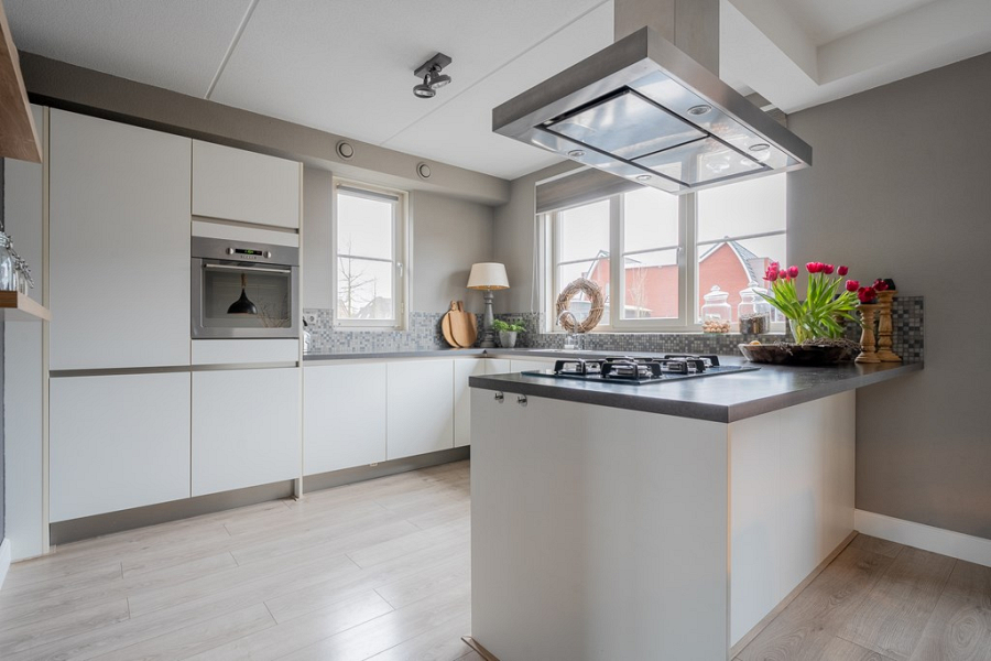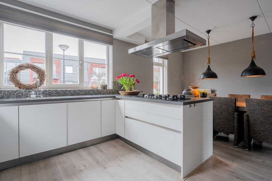 Vanaf de oprit met carport, kom je binnen in de sfeervolle hal met garderobe, trapopgang, meterkast en toiletruimte. De moderne en ruime keuken is gesitueerd aan de voorzijde van de woning en is van alle gemakken voorzien zoals een 5-pits gasfornuis met afzuigkap, een oven, een vaatwasser en koelkast. En door de vele kast- en werkruimte wordt iedere thuiskok hier toch blij van?