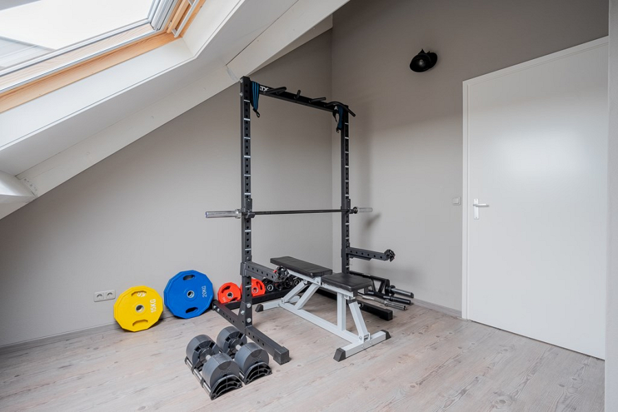 Terug naar de hal vinden wij daar tevens nog de toegang naar de inpandige berging. Deze is ook volledig geïsoleerd, voorzien van krachtstroom (380V) en koud- en warm water. Deze ruimte kan dus ook goed gebruikt worden als speelkamer of werkkamer. Tevens is hier een loopdeur naar de achtertuin aanwezig.