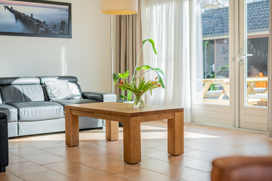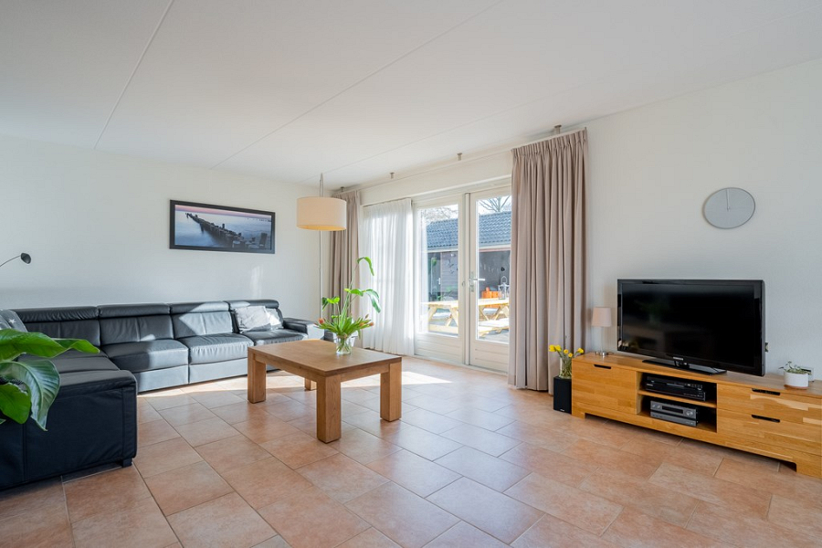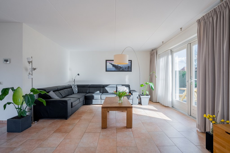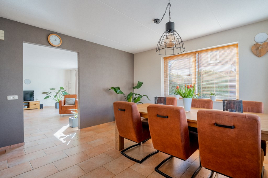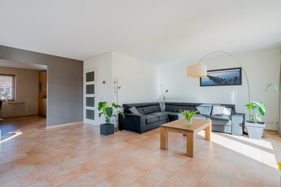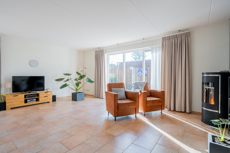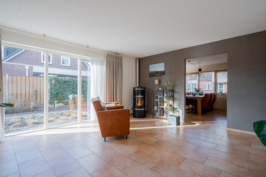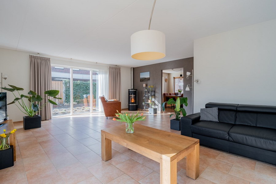 De riante woonkamer is tuingericht, voorzien van openslaande deuren en door de vele raampartijen zeer licht te noemen! Tijdens de koude dagen kun je hier ook genieten van de behaaglijke warmte van de pelletkachel.