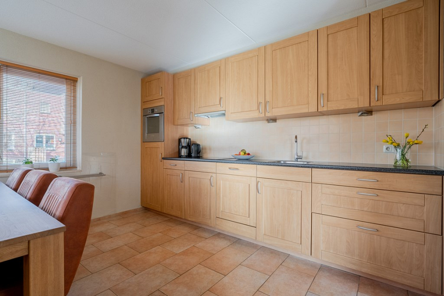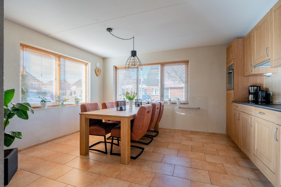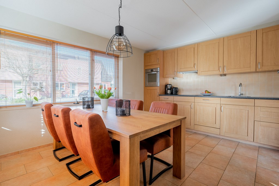 De ruime woonkeuken ligt aan de voorzijde van de woning. Hier is plek genoeg voor een enorme eettafel, waar je met vrienden en/of familie avonden heerlijk kunt tafelen. De keukenopstelling is ook van alle gemakken voorzien zoals een inductie kookplaat, oven, een vaatwasser, afzuigkap en koelkast.