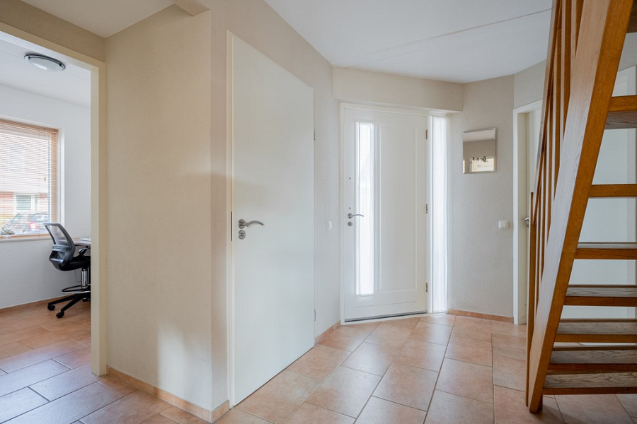 De hal, het centrale punt van de woning, geeft naast de bijkeuken ook toegang aan het toilet, de werkkamer en de woonkamer. Ook is hier de garderobe en de meterkast gesitueerd, met de trapopgang naar de verdieping.