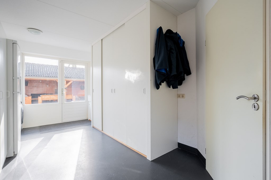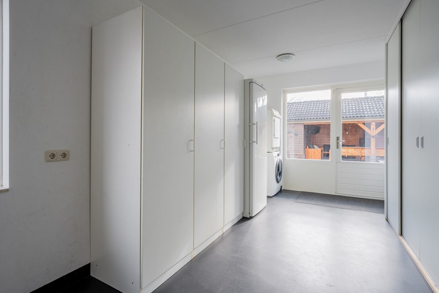 De bijkeuken is voorzien van een grote vaste kast en tevens bevinden zich hier de witgoedaansluitingen. De bijkeuken heeft zowel dubbele deuren naar de voorzijde van de woning, als een loopdeur naar de achtertuin.
