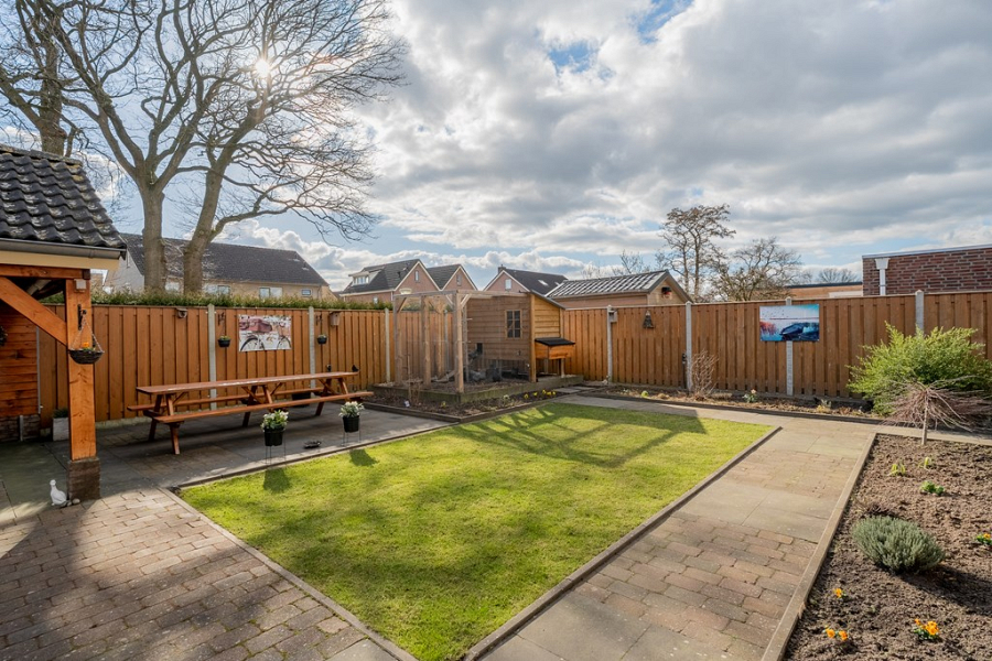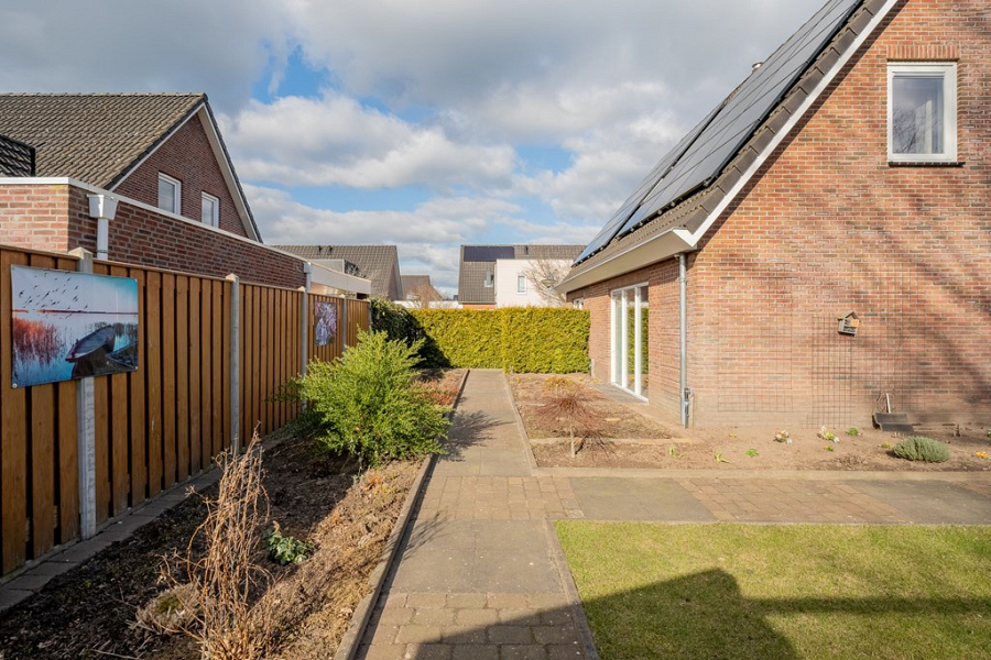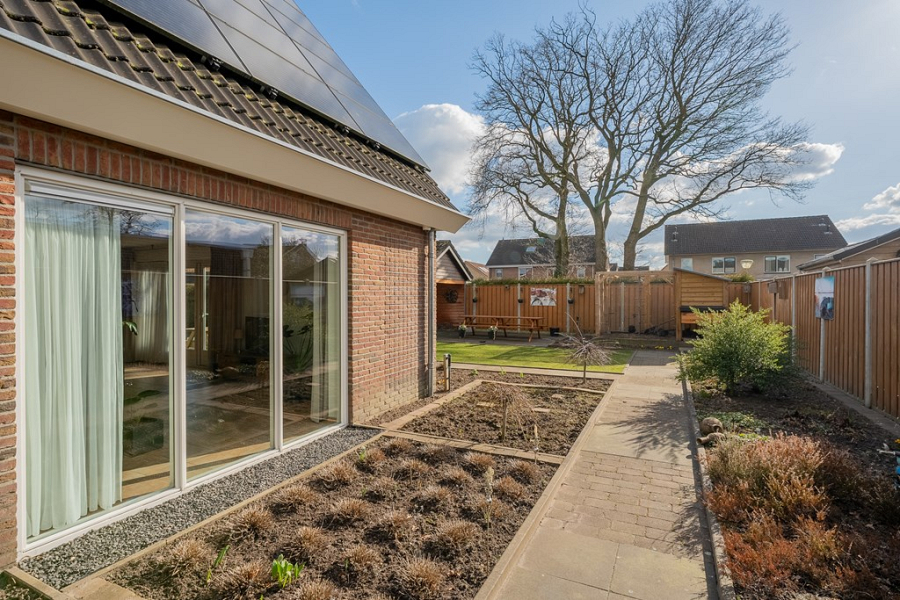 En last but not least, de zonovergoten tuin op het zuiden. Een zeer fijne plek, welke zeer veel privacy biedt en waar ieder seizoen wat gebeurt en die met liefde door de huidige eigenaren is verzorgd. In de tuin is een sproei installatie aangelegd en is van afstand bedienbaar. Je kunt dus met een gerust hart op vakantie gaan en van afstand je tuin besproeien! Wel oppassen dat de buren niet buiten zitten, maar dit kun je in de gaten houden met het camera systeem welke rondom de woning is aangelegd.