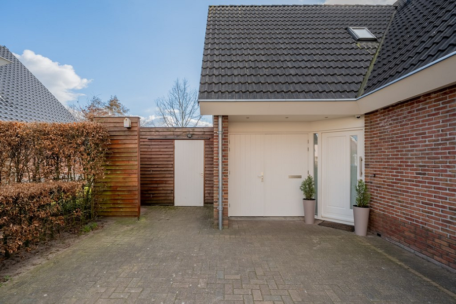 Via de oprit kom je uit bij de entree van de woning. Je hebt de keus, ga je via de voordeur of kom je 'achterom' via de bijkeuken.