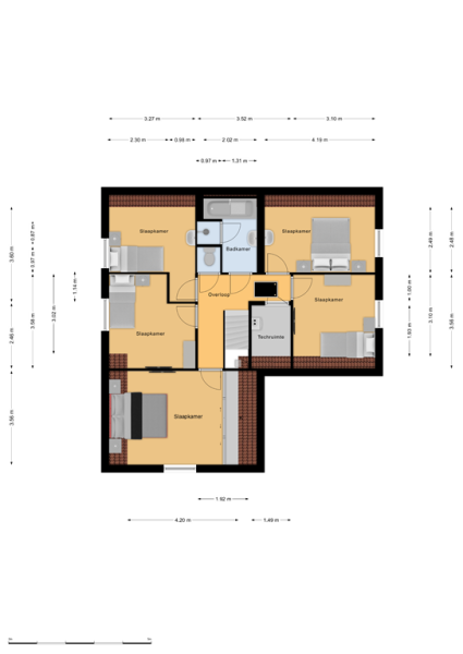 Terug naar de hal gaan wij naar de verdieping. De overloop geeft toegang aan maar liefst 5, ruim bemeten slaapkamers, het separate toilet en de badkamer. Nog even een kleine reminder; ook hier is vloerverwarming aanwezig en apart, per kamer te reguleren!