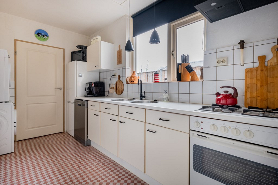 De lichte en L-vormige woonkamer is voorzien van een Bruynzeel parketvloer, welke vorig jaar nog opnieuw is gelakt. Tevens geeft de diepe en groene voortuin veel privacy aan deze ruimte. De dichte keuken is voorzien van een gasfornuis, oven en afzuigkap en geeft toegang aan de praktische bijkeuken. Deze ruimte heeft een deur naar de achtertuin. Via de andere deur in de bijkeuken bereik je de garage. De garage is voorzien van een elektrisch bedienbare, sectionaal garagedeur en een smeerput, ideaal voor de hobbyist! Ook is er water en elektra aanwezig. Kortom een ruimte welke voor vele doeleinden te gebruiken is.