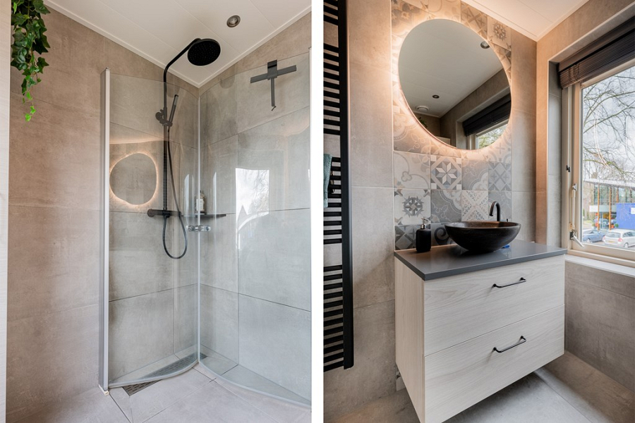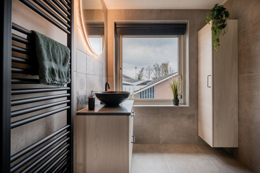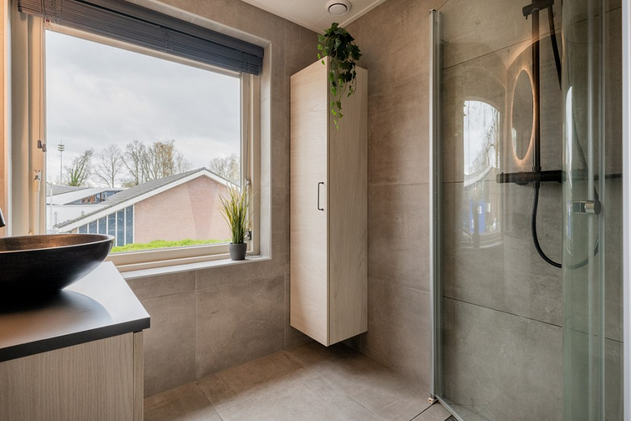Terug naar de hal, gaan wij via de trapopgang naar de eerste verdieping. We komen uit op de overloop, welke toegang geeft aan de 3 slaapkamers en de moderne badkamer. De badkamer is net vorig jaar vernieuwd en voorzien van een inloopdouche, wastafel met meubel, verlaagd plafond met spotjes en een verwarmde spiegel.