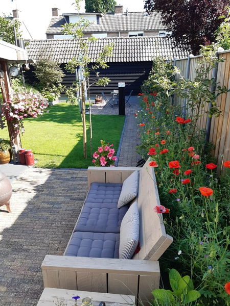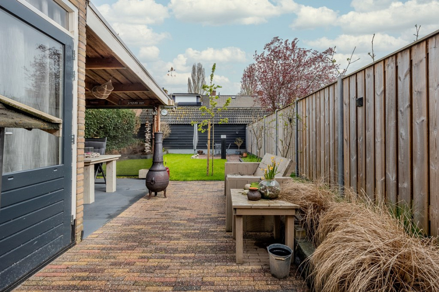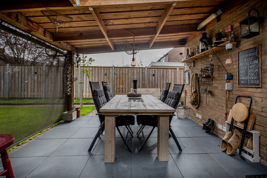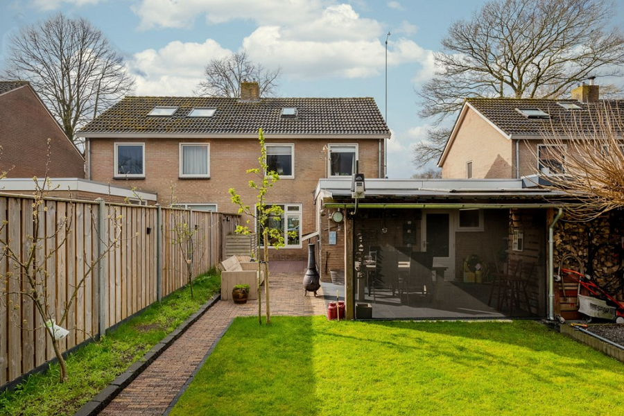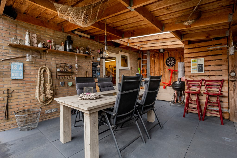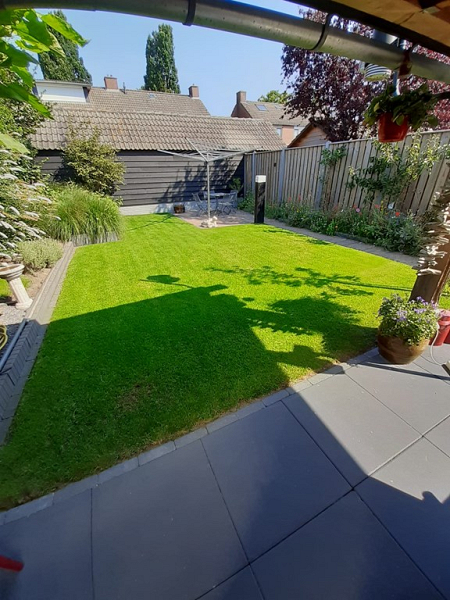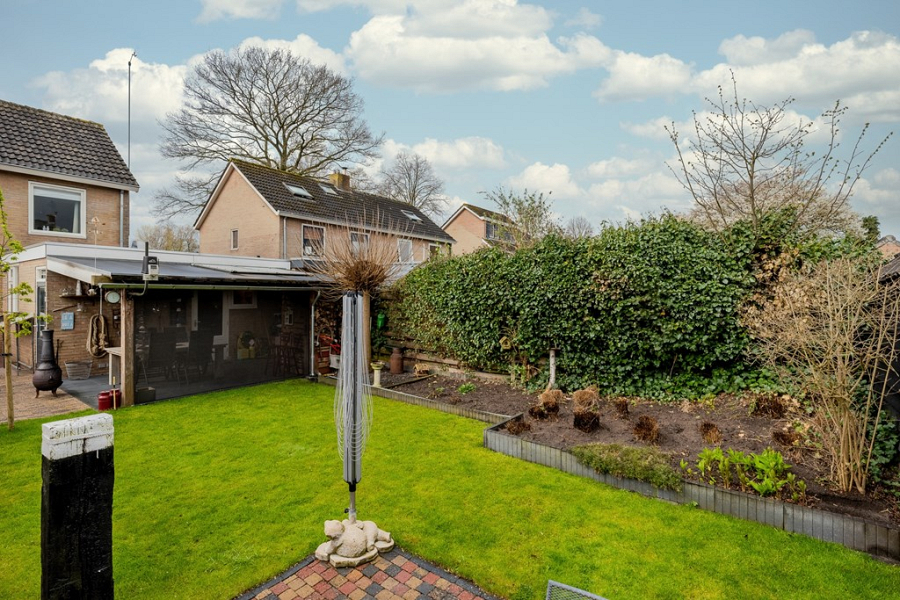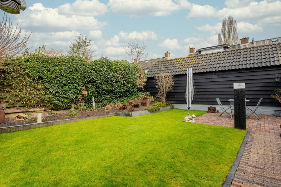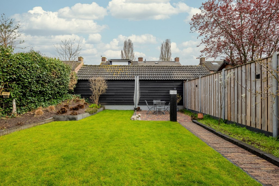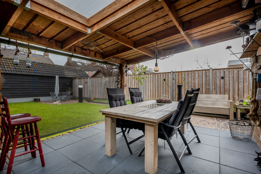 Vanuit de garage is er een deur naar de zeer verzorgd aangelegde achtertuin, voorzien van een prachtig gazon en mooi aangelegde borders met veldbloemen. Ook is de schutting met de buren onder de kap, 2 jaar geleden nog nieuw geplaatst. De tuin geeft veel privacy en is gelegen op het noorden. Door de diepte, heb je achterin de tuin gedurende de dag heerlijk de zon. De absolute eyecatcher van de tuin? De riante overkapping: de perfecte setting voor gezellige avonden met vrienden en familie. Heerlijke vakantiesferen in je eigen tuin. Dit maakt het plaatje helemaal af!