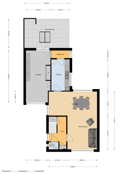 Via de oprit kom je binnen in de hal. Hier voel je gelijk al de gezelligheid en de huiselijke sfeer wat de woning uitademt! In de hal bevindt zich de toiletruimte, meterkast, garderobe, praktische trapkast en de trapopgang naar de verdieping.