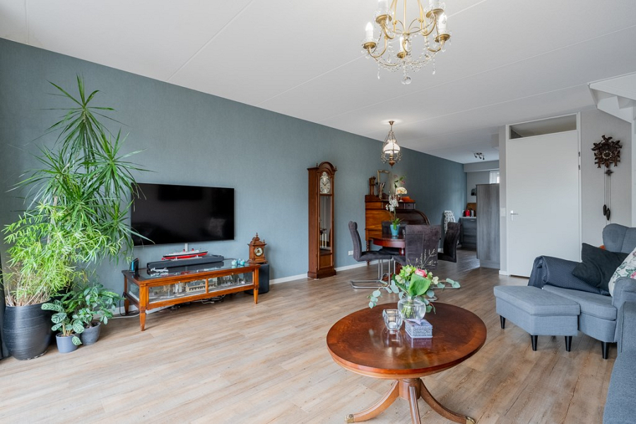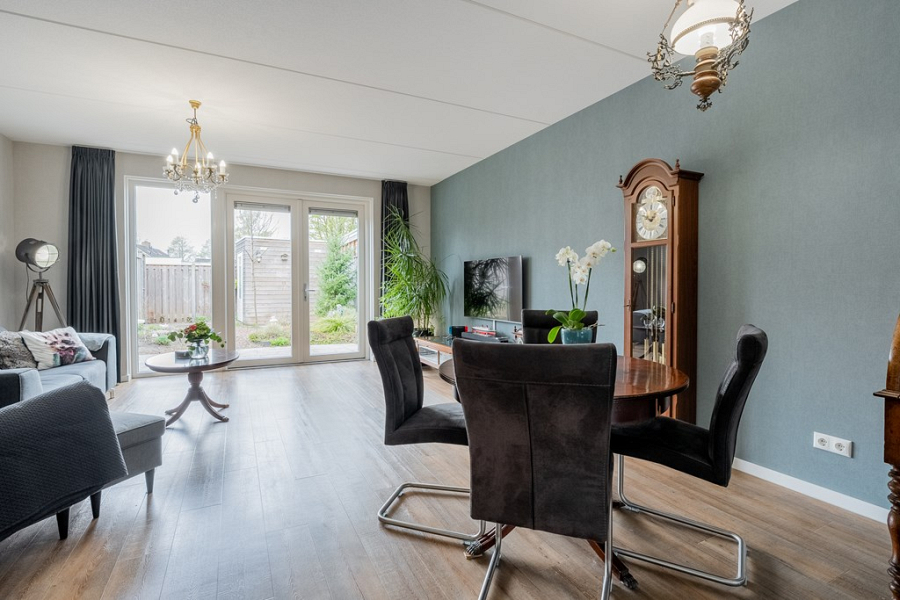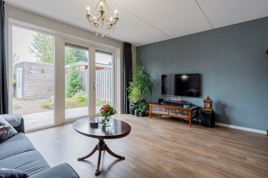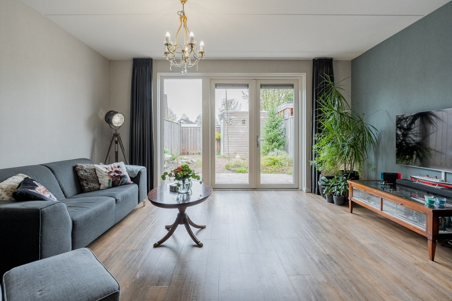 De woonkamer is aan de achterzijde van de woning gelegen met zicht op de tuin, welke middels openslaande deuren te bereiken is. Een ideale plek om tot rust te komen, met vrienden te borrelen of een goede film te kijken.