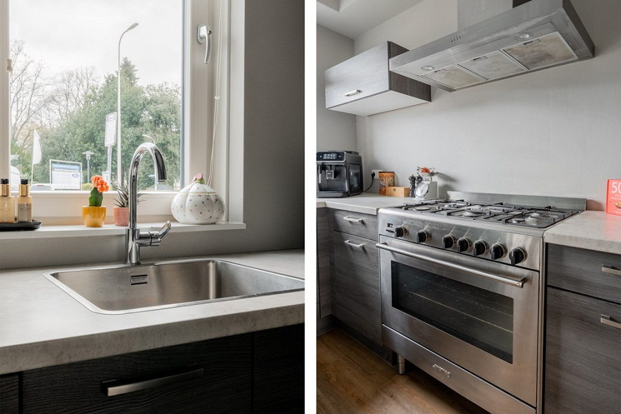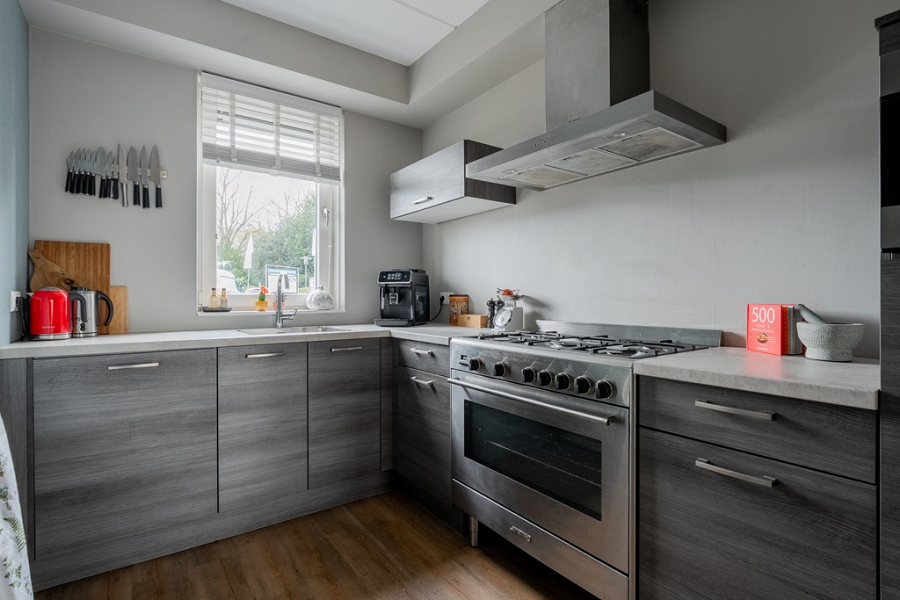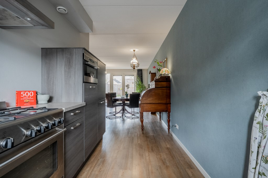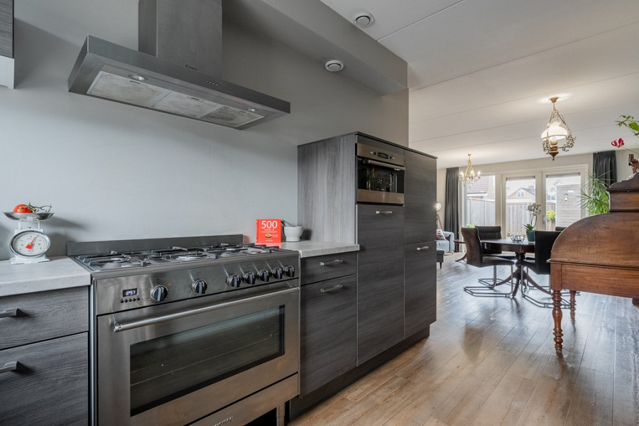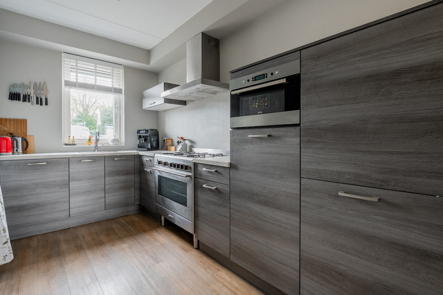 De moderne keuken is gesitueerd aan de voorzijde van de woning en is van alle gemakken voorzien zoals een SMEG 5-pits gasfornuis met oven, afzuigkap, een (combi) magnetron, een vaatwasser en koelkast. En door de vele kast- en werkruimte wordt iedere thuiskok hier toch blij van?