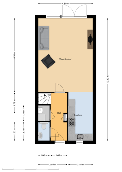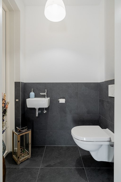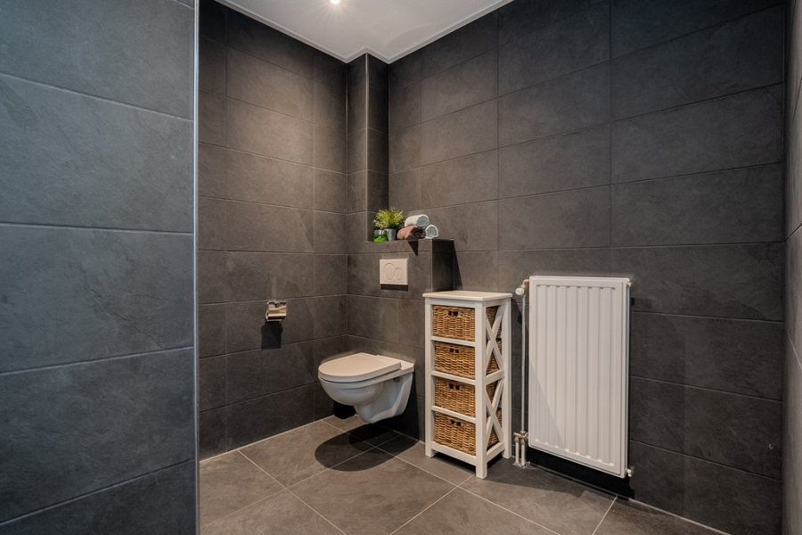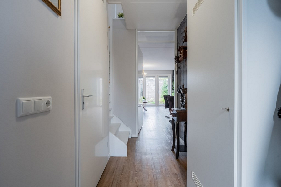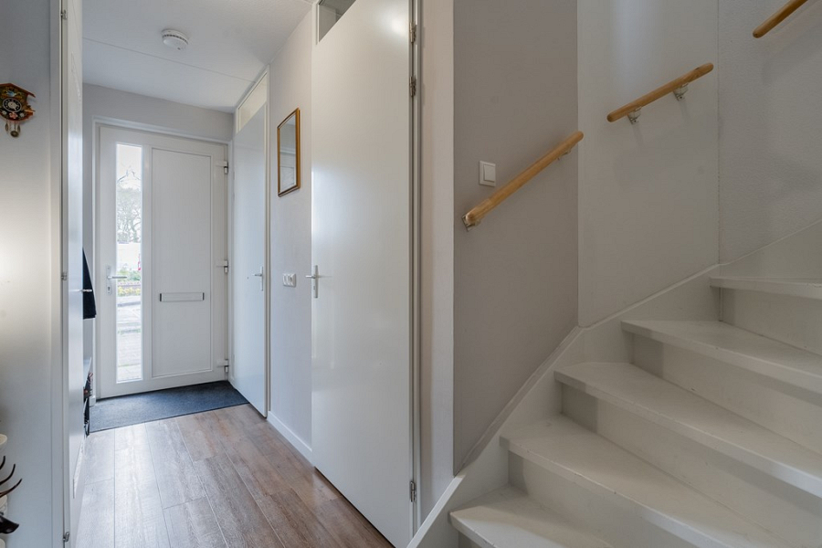 Je parkeert je auto op de parkeerplaats behorende bij de woning (aan het einde van het blok) en je loopt via het tuinpad door de voordeur naar binnen. Welkom! Je komt binnen in de lichte hal met trapopgang, garderobe en meterkast. Tevens geeft de hal toegang aan het moderne toilet en de berging met de opstelling voor de technische installaties en het witgoedapparatuur.