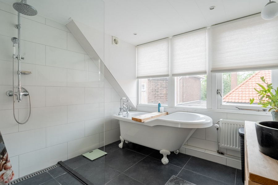In de hal bevindt zich de trapopgang naar de eerste verdieping. Hier zijn een overloop, 2 slaapkamers en de badkamer gesitueerd. De eigentijdse en ruime badkamer is voorzien van een ligbad, inloopdouche en wastafel met meubel.