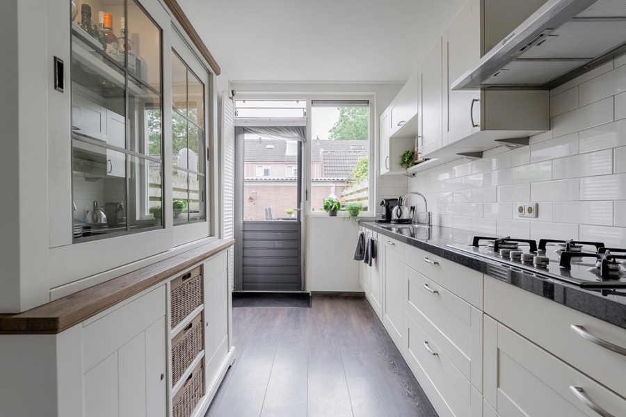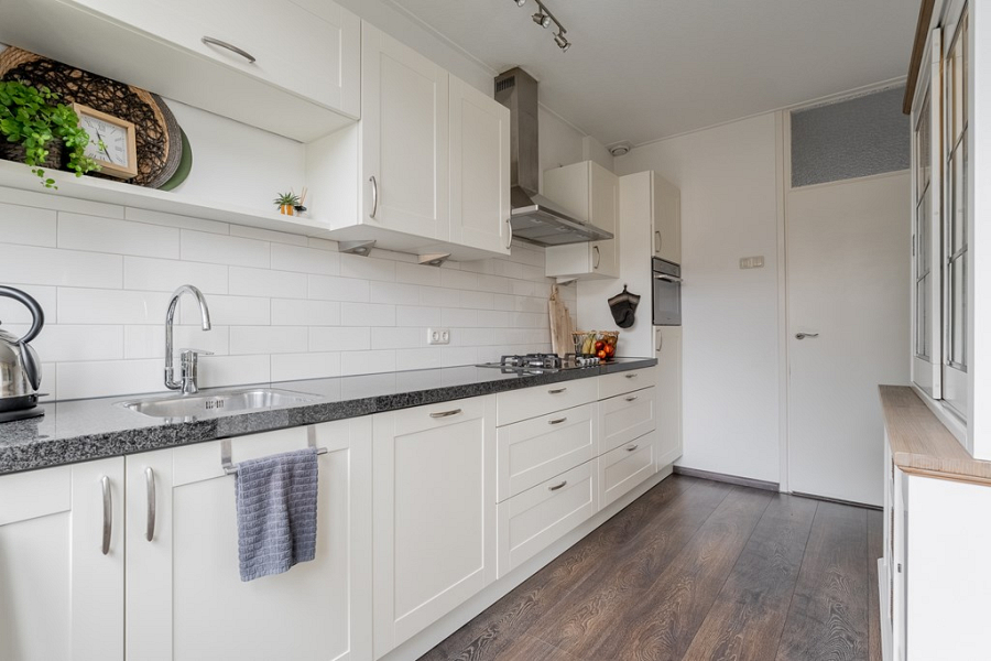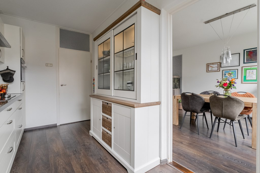 De gezellige doorzonwoonkamer, waar voldoende ruimte is om een comfortabele zithoek en eettafel te creëren, ligt afgescheiden van de moderne keuken. Deze fraaie keuken is voorzien van alle gewenste inbouwapparatuur. Of je nu een culinaire held bent of gewoon van gemak houdt, deze keuken maakt koken een feestje.