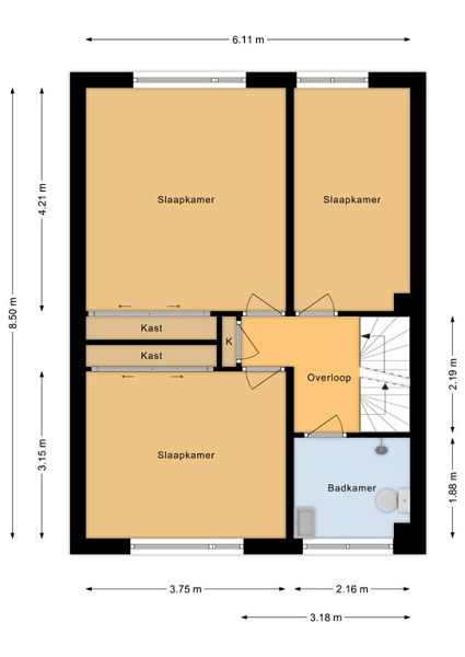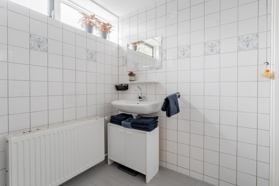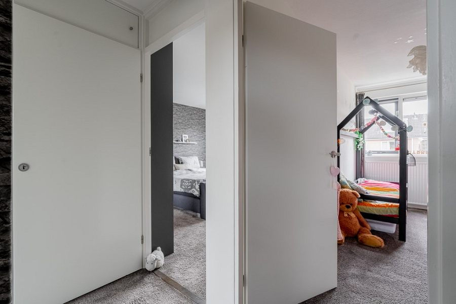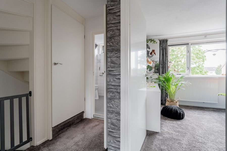 Op de eerste verdieping bevinden zich de overloop met inbouwkast, badkamer en drie slaapkamers. Bij binnenkomst van de slaapkamers valt meteen de ruimte op, evenals de prachtige inbouwkasten, met genoeg opbergruimte voor al je spullen welke gelegen zijn in de ouderslaapkamer en de slaapkamer aan de voorzijde van de woning. De badkamer is voorzien van een wastafel, douche en toilet. De badkamer biedt nog genoeg potentie om naar eigen smaak te moderniseren. Dit stond nog op het wensen lijstje van de verkopers, maar aangezien zij een nieuw pareltje hebben gevonden, laten ze dit over aan de nieuwe bewoners.