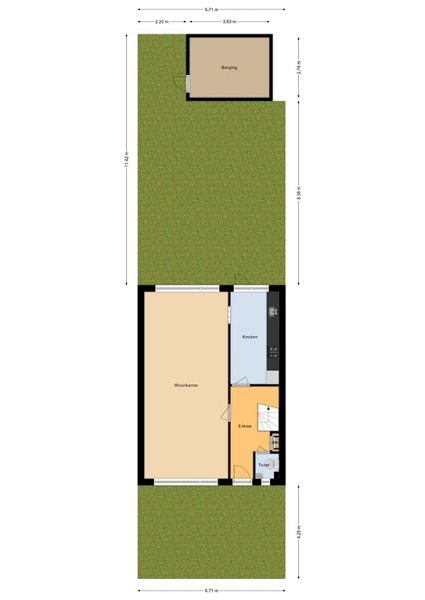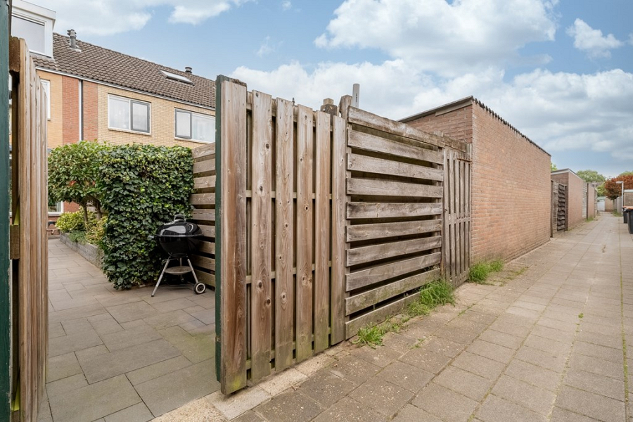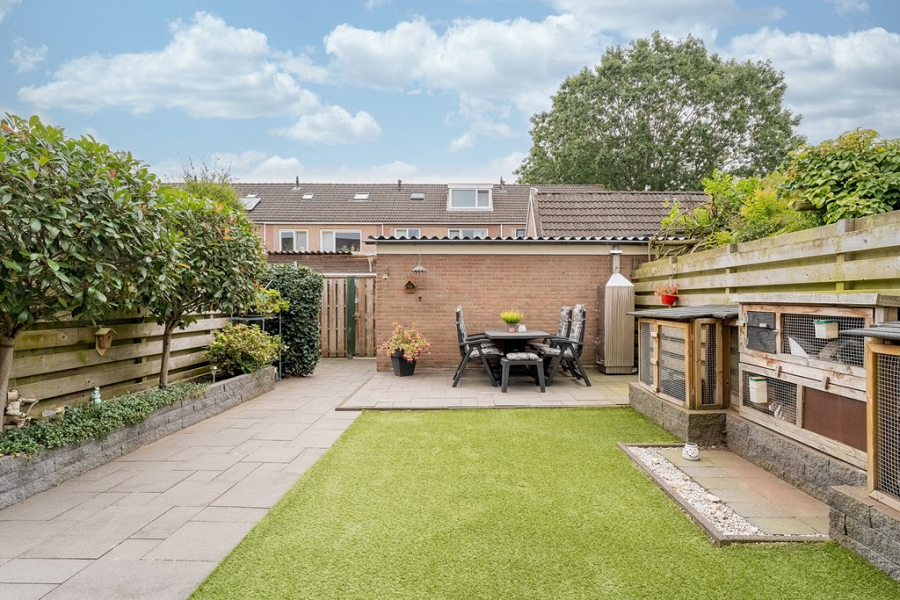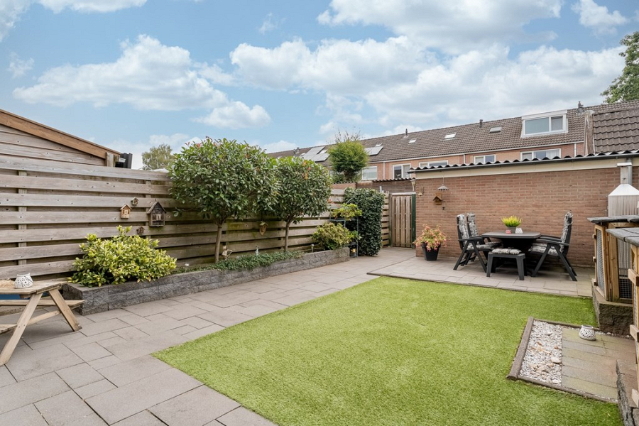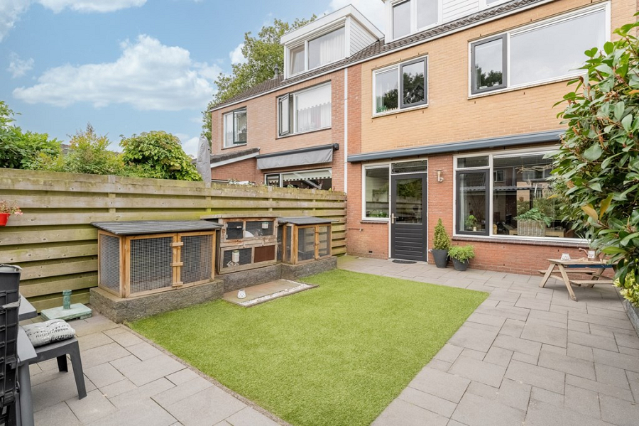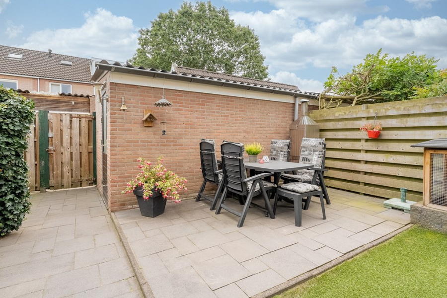 Terug naar beneden, betreden wij via een deur in de keuken de onderhoudsvriendelijke tuin. De gezellige achtertuin is gelegen op het oosten. Je kunt hier 's morgens genieten van de vroege zonnestralen terwijl je je eerste kop koffie van de dag of een lekker ontbijtje nuttigt, máár doordat de tuin vrij diep is heb je achterin de tuin op mooie zomerdagen ook nog de zon. Kortom een ideale tuin om gezellige barbecues te organiseren en te ontspannen! De woning heeft tevens een achterom ingang, vanuit een brede steeg en is nog voorzien van een praktische vrijstaande stenen berging.