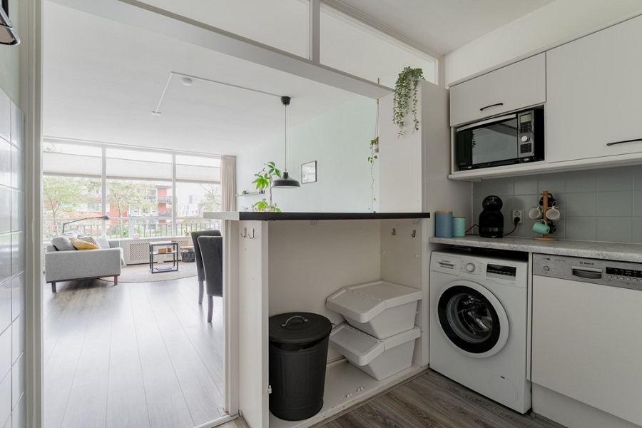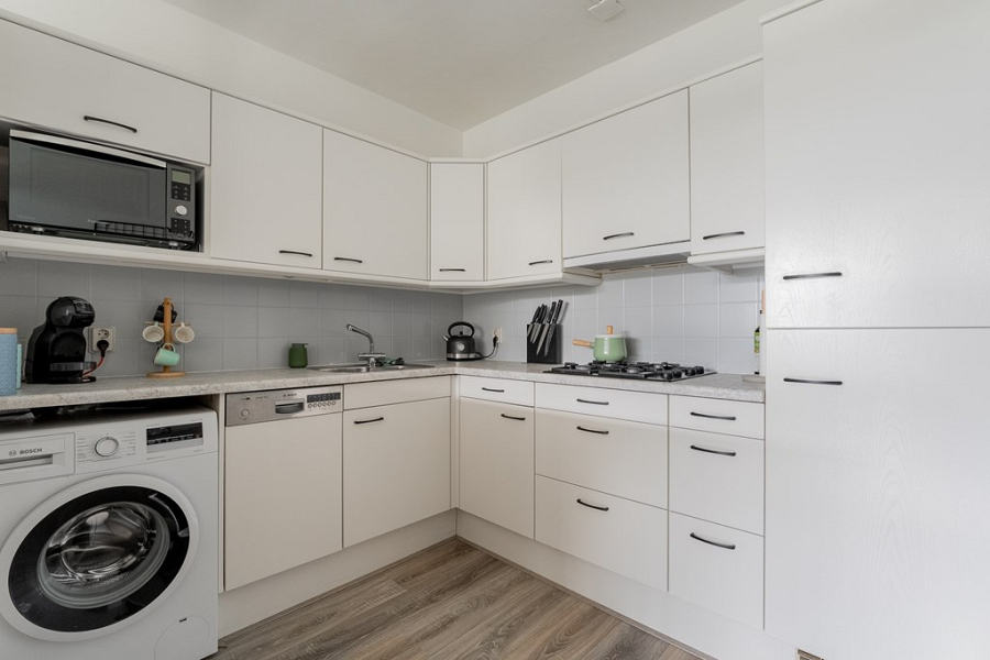 Vanuit de hal kom je in de sfeervolle woonkamer met half open keuken. Het eerste wat je hier opvalt is het fraaie lichtinval door de vele raampartijen! De keuken is voorzien van een 4-pits gaskookplaat, afzuigkap, vaatwasser, koelkast met vriesvak en veel kastruimte. Tevens zijn in de keuken de aansluitingen voor het witgoedapparatuur aanwezig. Vanuit de woonkamer kom je in de aangrenzende slaapkamer met inloopkast. Vanuit de slaapkamer is ook het balkon bereikbaar. Het gehele appartement is voorzien van een keurige laminaatvloer en is zo te betrekken!