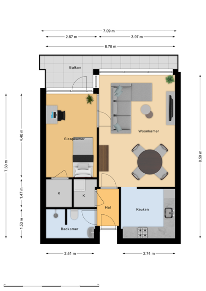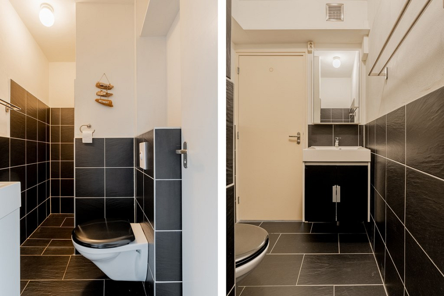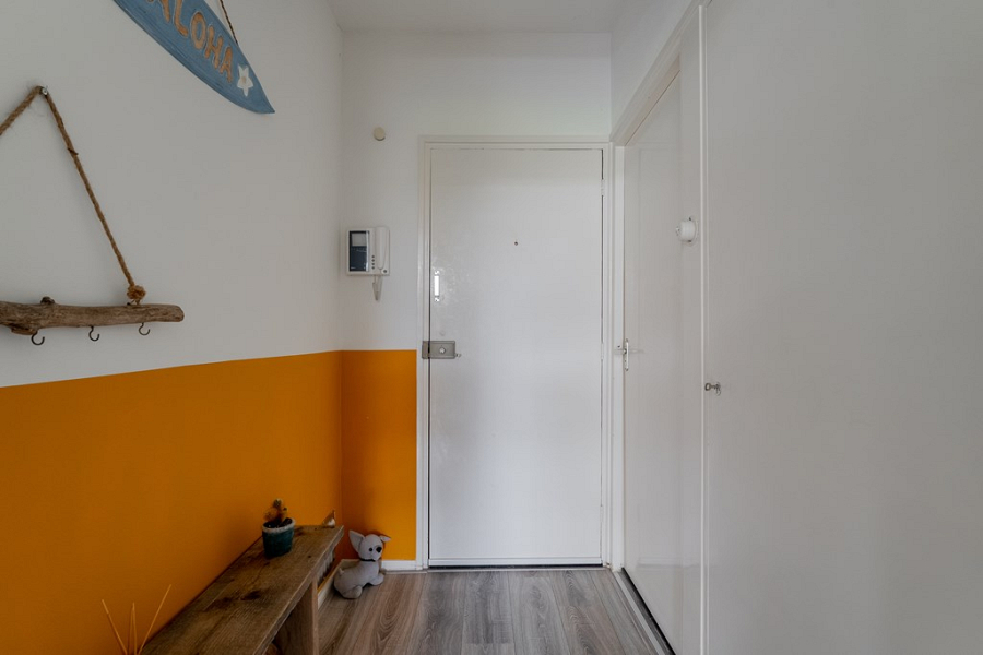 Je komt binnen in de hal welke toegang geeft aan de badkamer en de bergkast. De moderne badkamer is voorzien van doucheruimte, toilet en wastafel met meubel. De bergkast is zeer praktisch voor het opbergen van spullen, hier is tevens de boiler (huur) gesitueerd.