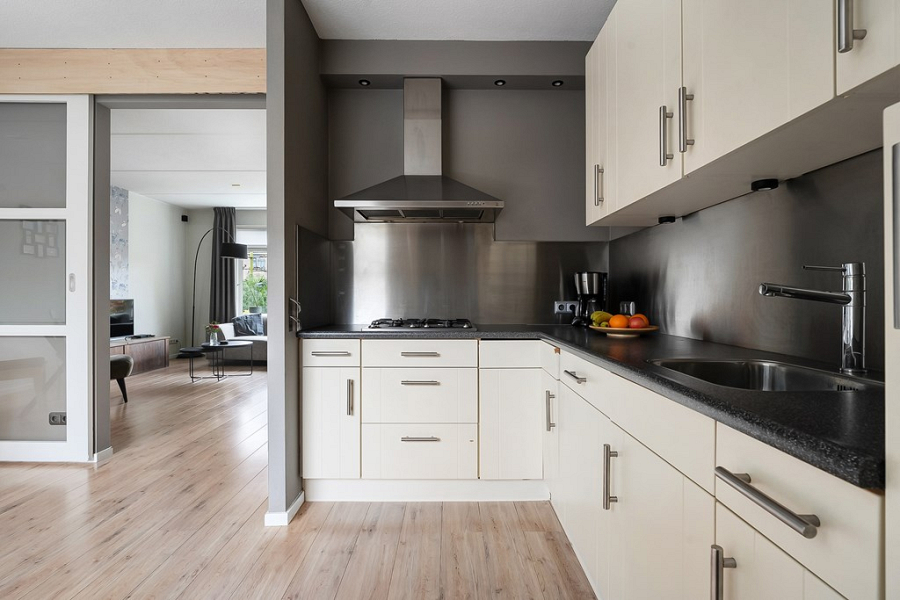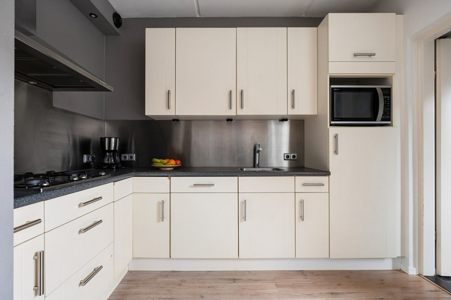 De keuken biedt voldoende werk-en opbergruimte en beschikt over de nodige inbouwapparatuur zoals een vaatwasser, koelkast, 4-pits gasfornuis en afzuigkap.