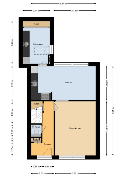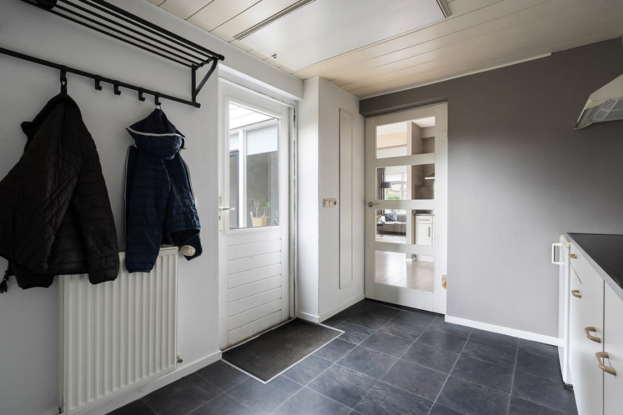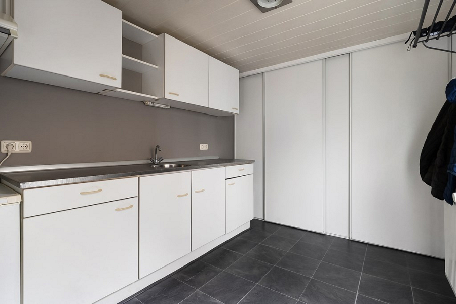 Aansluitend aan de keuken bevindt zich de bijkeuken. Deze ruimte is geïsoleerd en voorzien van een keukenblok met warm en koud water en een inbouwkast. Tevens is vanuit deze ruimte middels een vlizotrap een bergzolder te bereiken voor het opbergen van spullen welke je niet elke dag gebruikt.