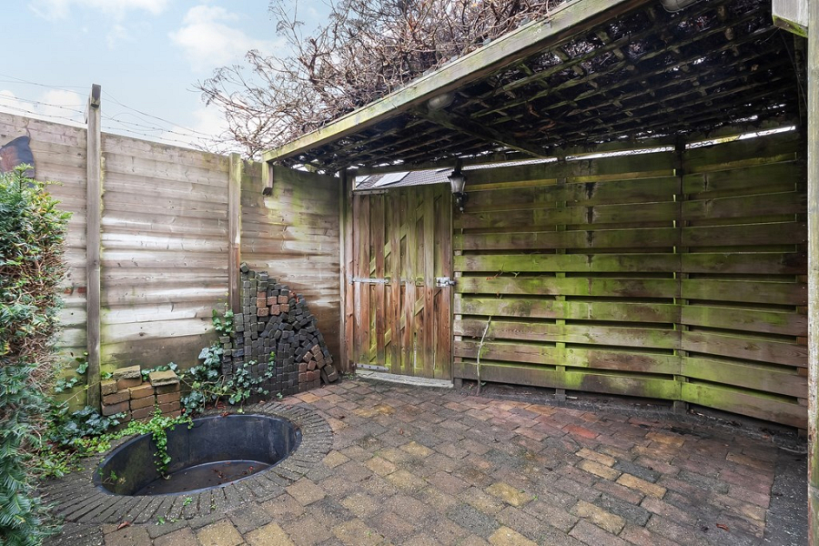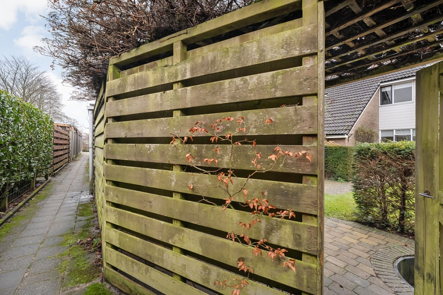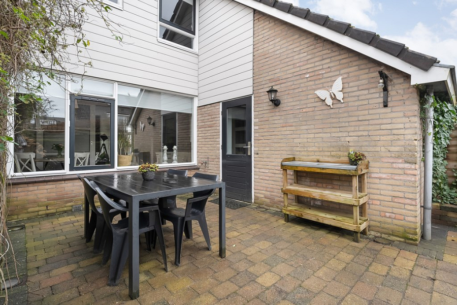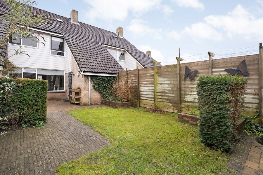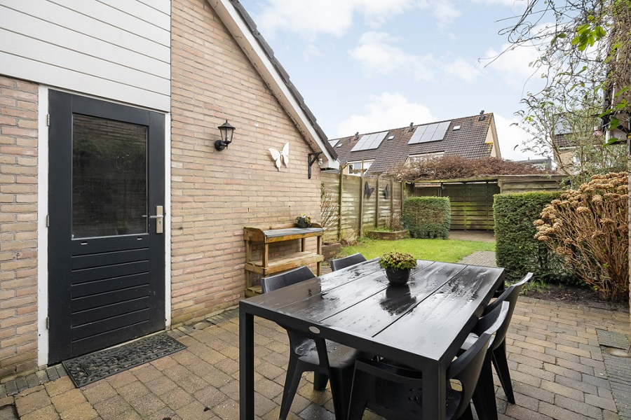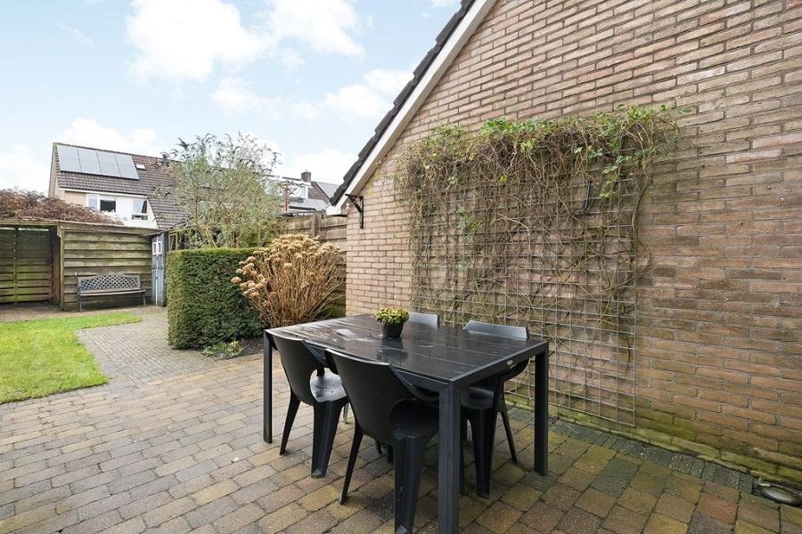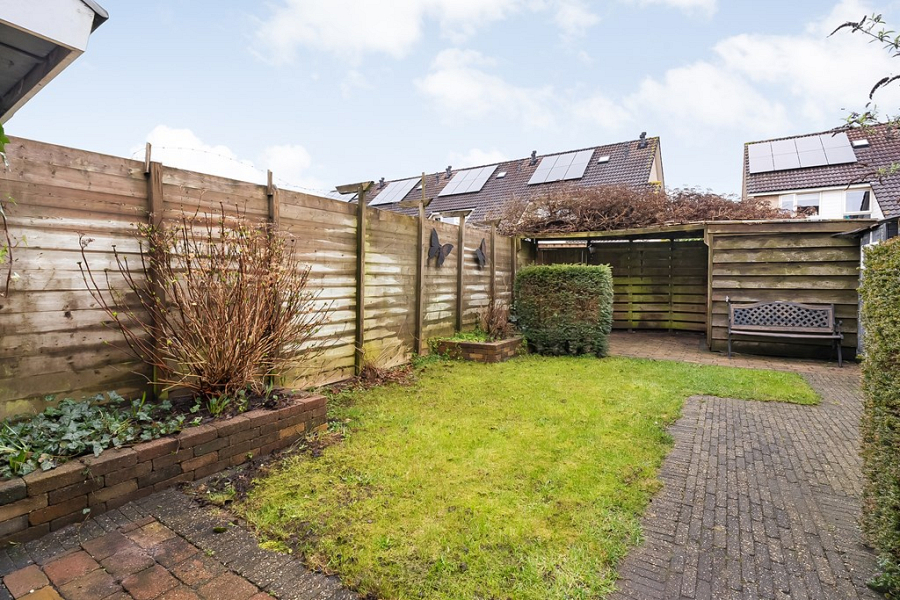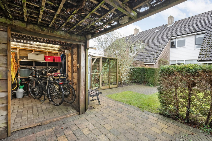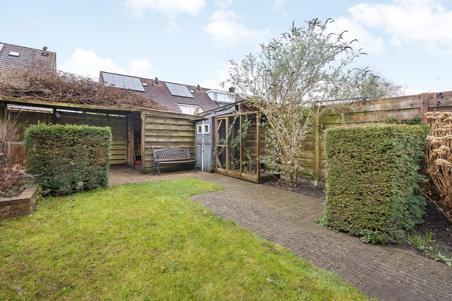 Via een deur in de bijkeuken bereik je de ruime achtertuin, met achterom ingang en een vrijstaande houten berging. De tuin is gelegen op het noordwesten. En door de diepte kun je hier heerlijk genieten van de zon!