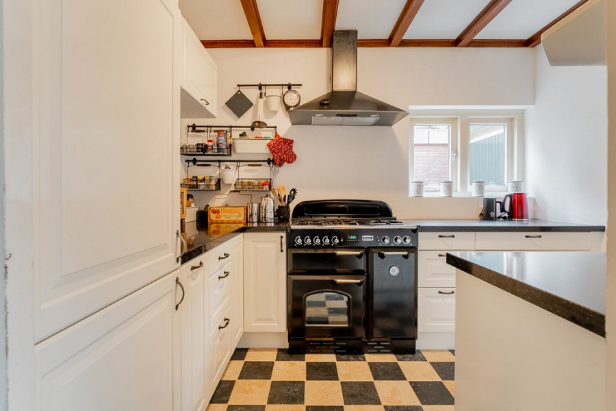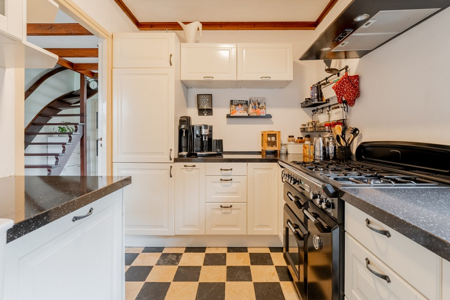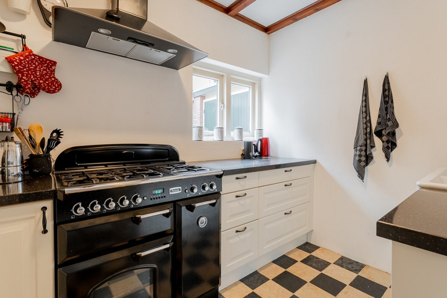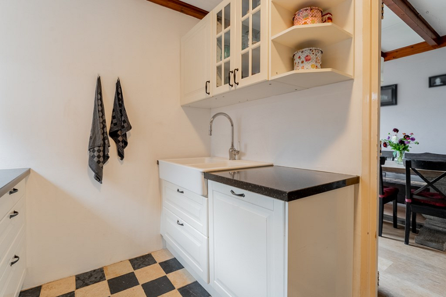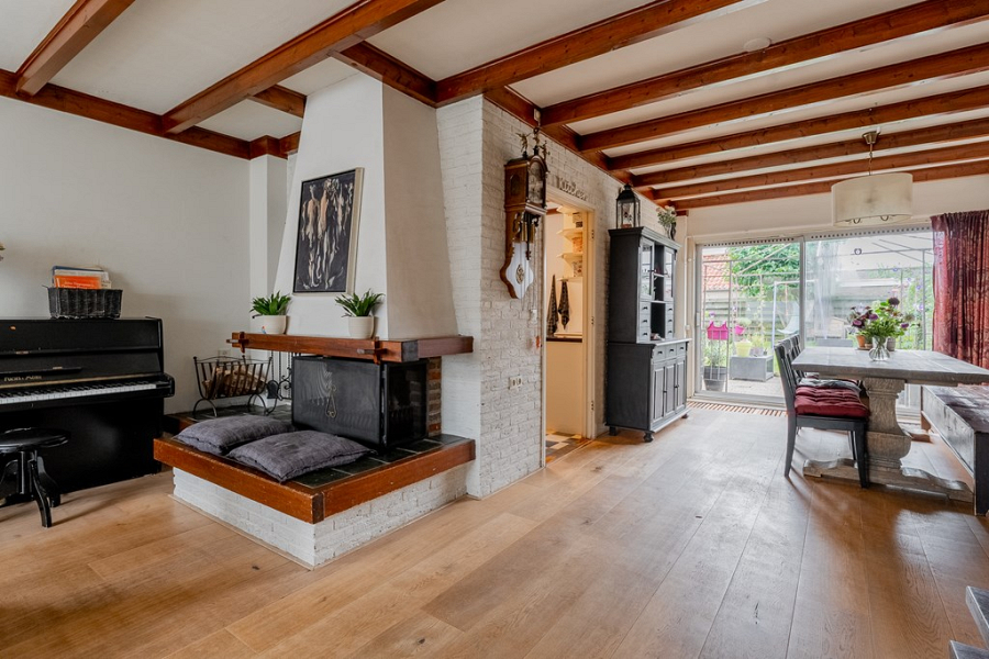Via het tuinpad kom je binnen in de hal. In de hal bevindt zich de meterkast en de garderobe. De lichte en Z-vormige woonkamer is voorzien van een parketvloer en de trapopgang naar de verdieping. Tijdens de koude dagen kun je hier ook genieten van de behaaglijke warmte van de open haard. De eetkamer is voorzien van een schuifpui, dit is een fijne manier om binnen met buiten te verbinden op de mooie dagen. De dichte keuken is een ideale plek voor de thuiskok. Er is een Falcon gasfornuis, oven, afzuigkap, koelkast met vriezer, een vaatwasser en veel kast-en werkruimte afwezig. Via een deur in de eetkamer kom je in een tussenhal met het toilet en deze ruimte biedt tevens toegang aan de garage. Ideaal voor de hobbyist!