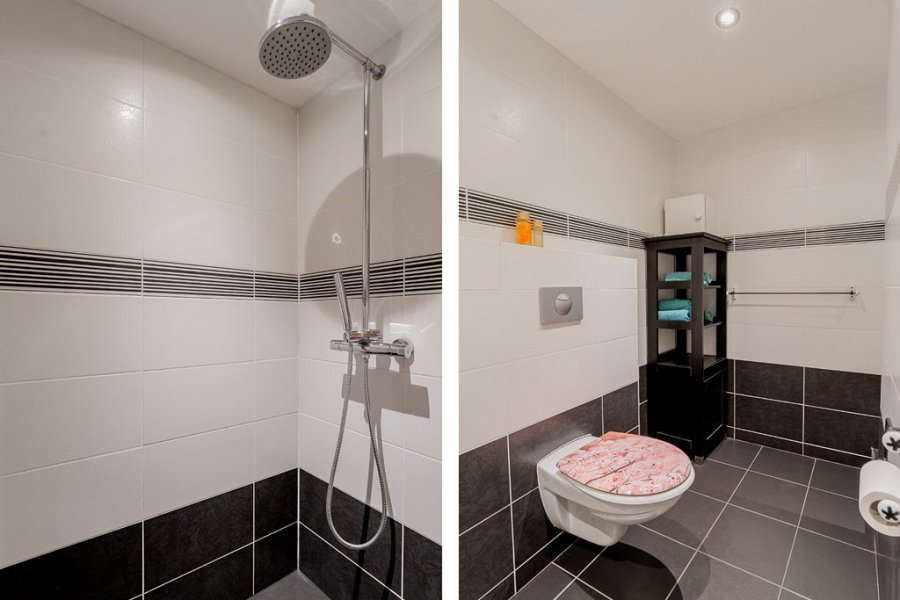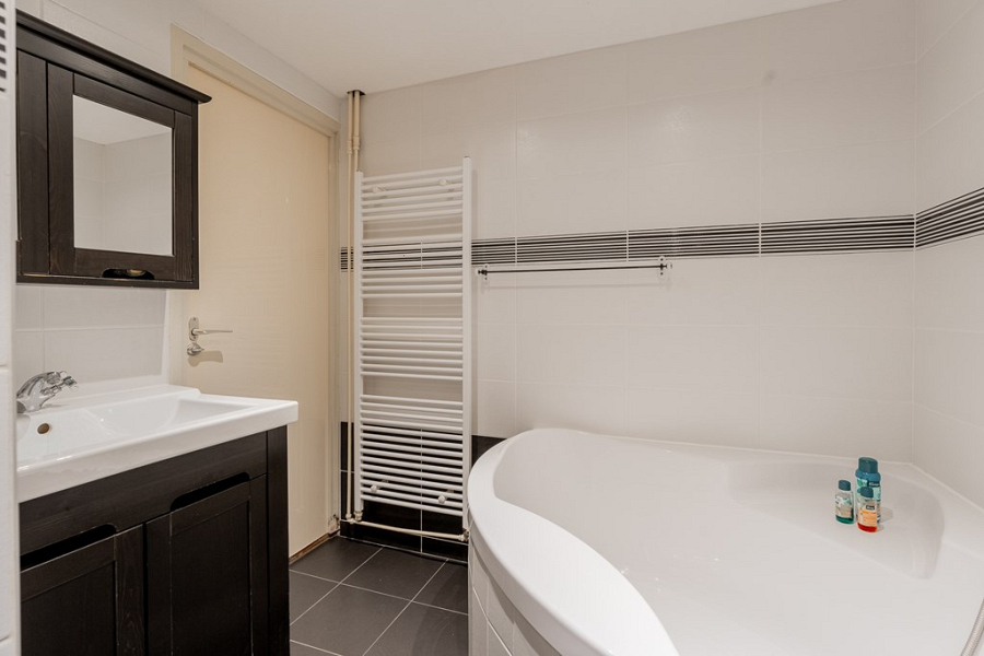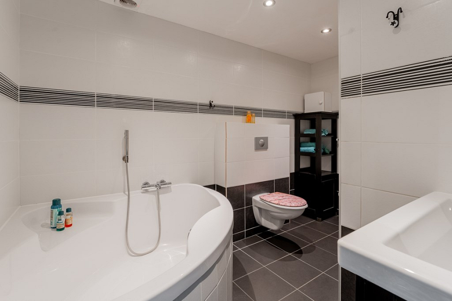 Terug naar de woonkamer, gaan wij via de trapopgang naar de eerste verdieping. We komen uit op de overloop, welke toegang geeft aan de drie slaapkamers en de badkamer. De badkamer is voorzien van een inloopdouche, ligbad, designradiator, wastafel met meubel en 2e toilet.