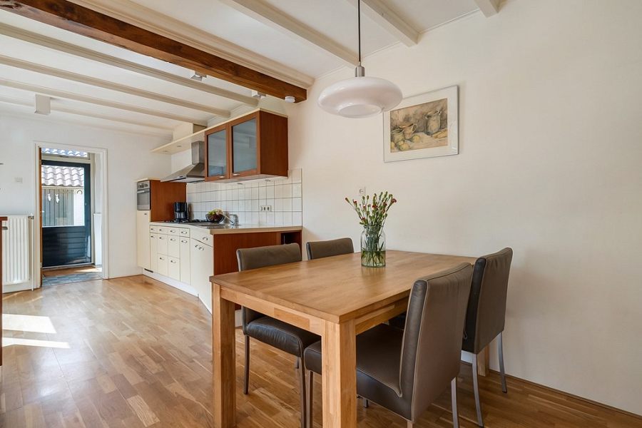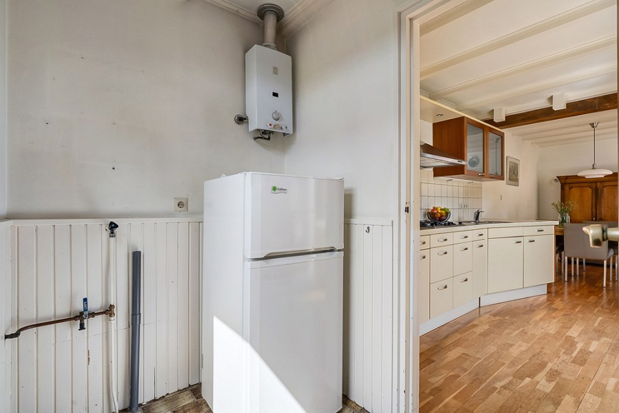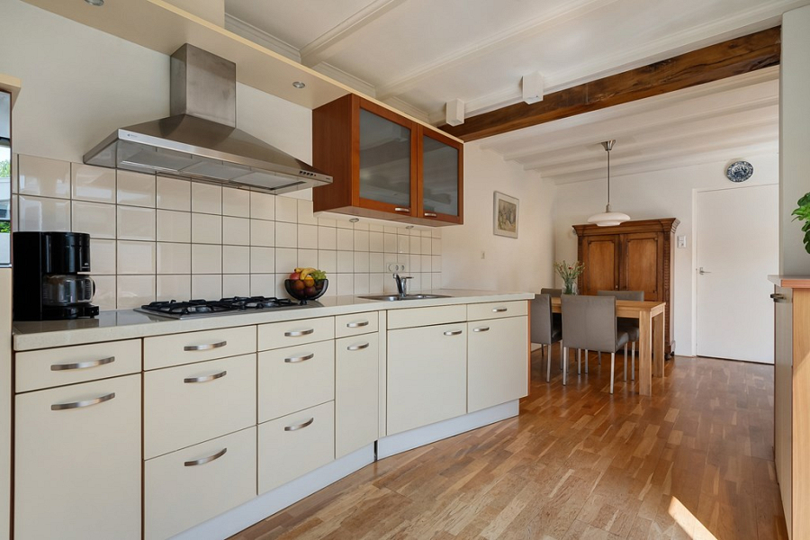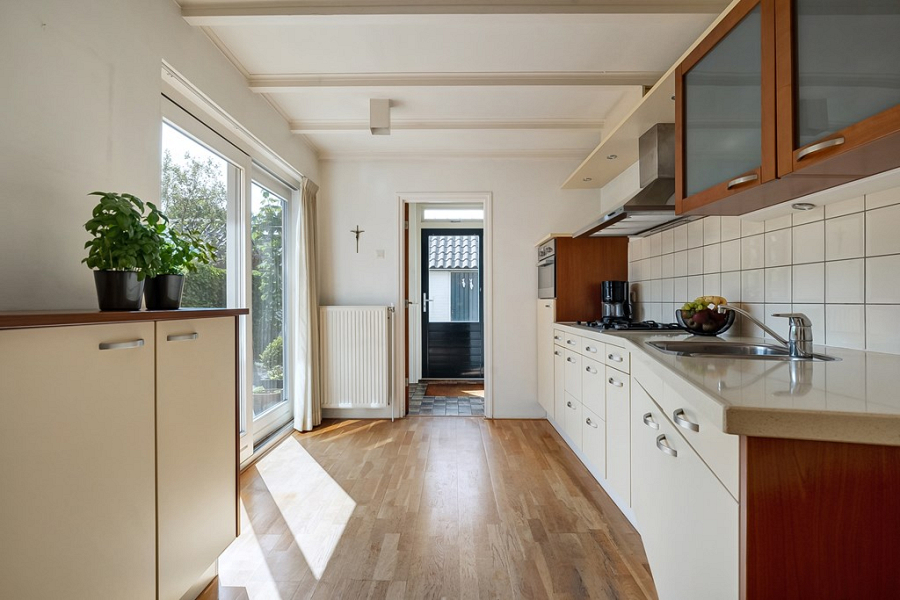 De gezellige woonkamer, welke door de grote raampartijen zeer licht te noemen is, is voorzien van een sfeervolle open haard. Ideaal voor de koude wintermaanden! De keuken is gesitueerd in de uitbouw en voorzien van een gaskookplaat, combi magnetron, koelkast en veel kast-en werkruimte. Via de praktische bijkeuken, met aansluitingen voor het witgoedapparatuur, bereik je de achtertuin.