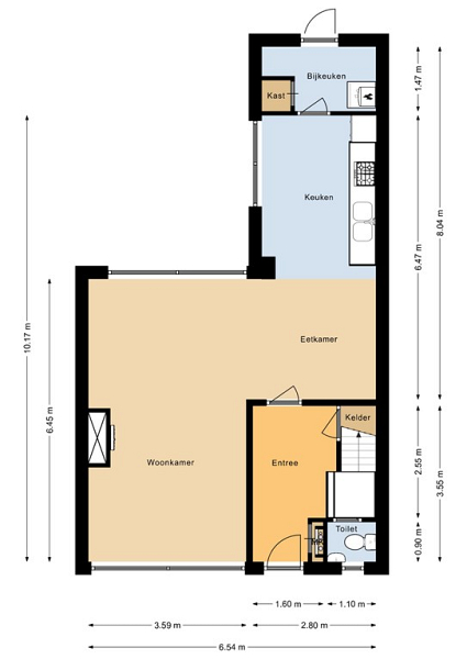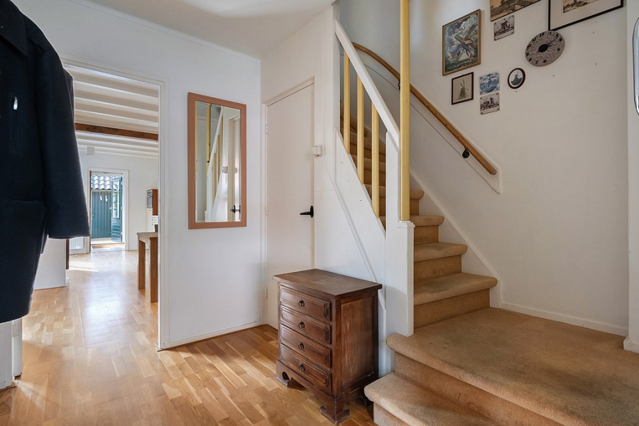 Binnen tref je een ruime hal, een trap die leidt naar de bovenverdieping, een handige kelder en de toegang naar het toilet. De gehele begane grond (m.u.v. de bijkeuken) is voorzien van een eiken houten Bruynzeel vloer.
