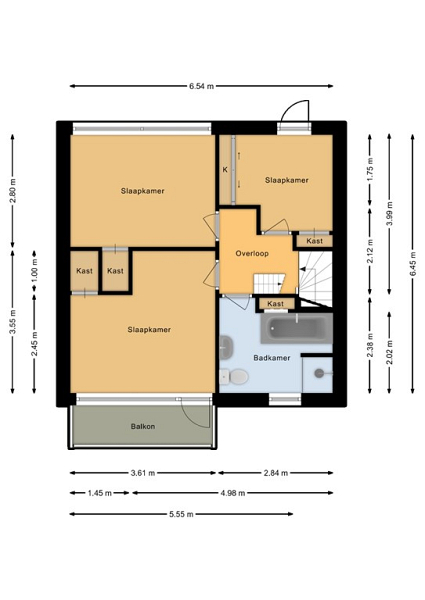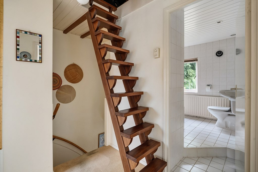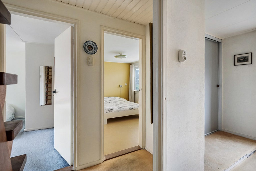 Terug naar de hal bereiken wij via de trap de eerste verdieping. Via de overloop kom je uit in de 3 slaapkamers, waarvan één toegang geeft tot het platte dak.