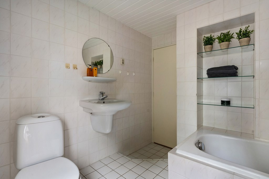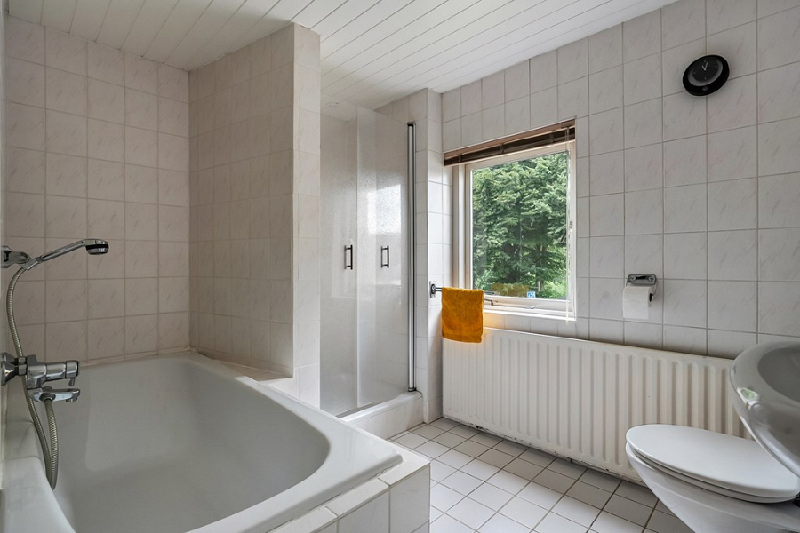 De ruime badkamer is gesitueerd in één van de oorspronkelijke slaapkamers en voorzien van een douchehoek, ligbad, 2e toilet en wastafel.