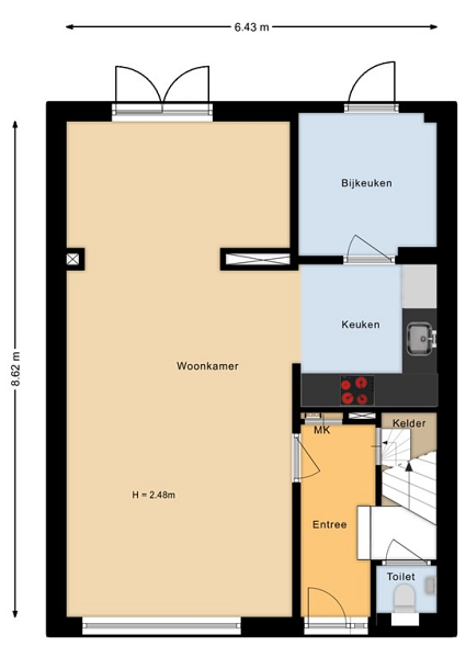 Via het tuinpad kom je binnen in de hal, met meterkast, kelderkast, trapopgang en het moderne toilet. De hal geeft ons toegang aan de woonkamer en keuken. De ruime woonkamer heeft mooie grote raampartijen wat zorgt voor fijn lichtinval, tevens zijn er openslaande deuren aanwezig welke toegang geven tot de tuin. De keuken staat in een open verbinding met de woonkamer. Dit betreft een moderne keuken met diverse inbouwapparatuur. Onder andere voorzien van een vaatwasser, koelkast, combi oven en inductiekookplaat met afzuigkap.